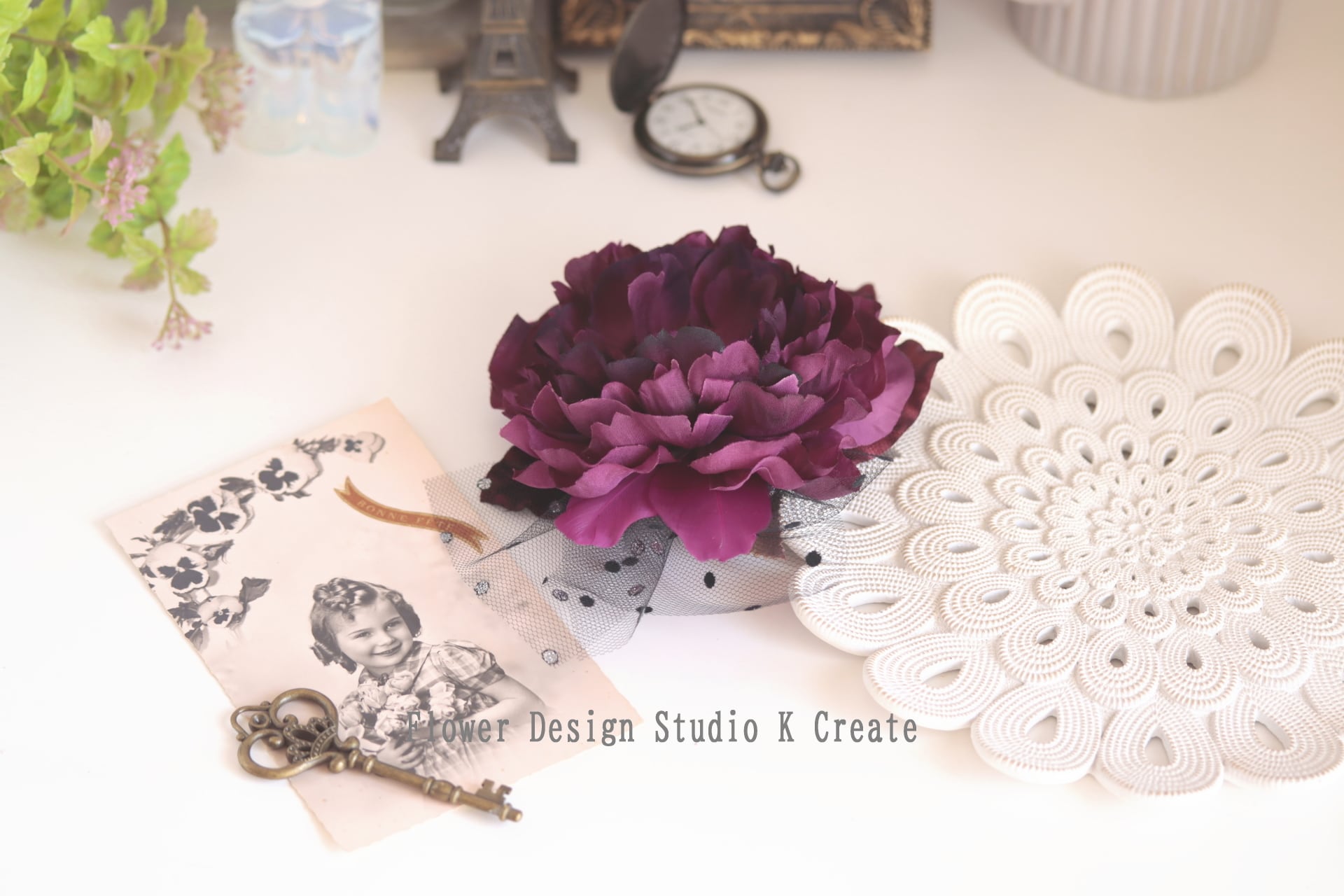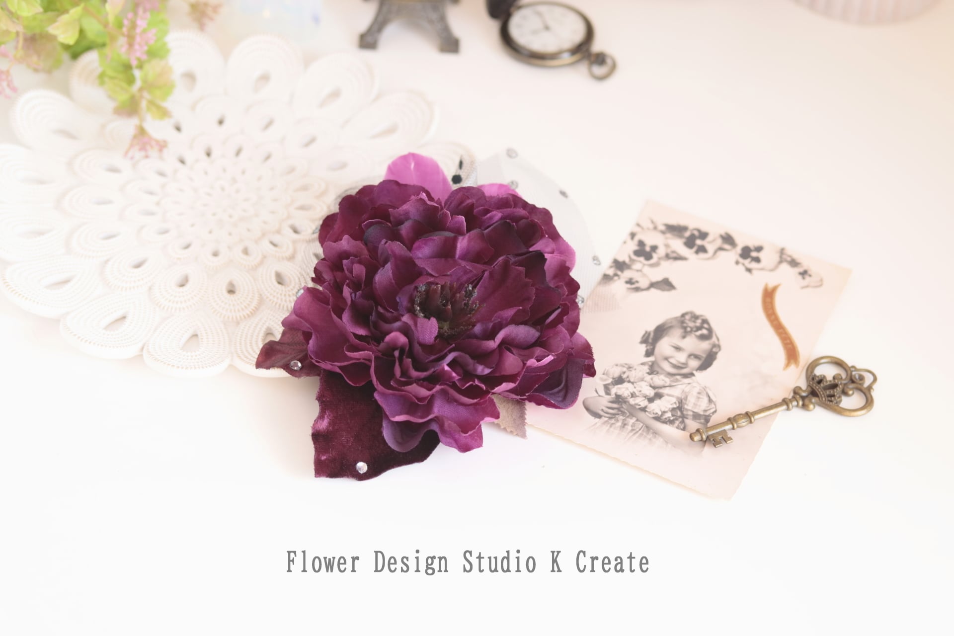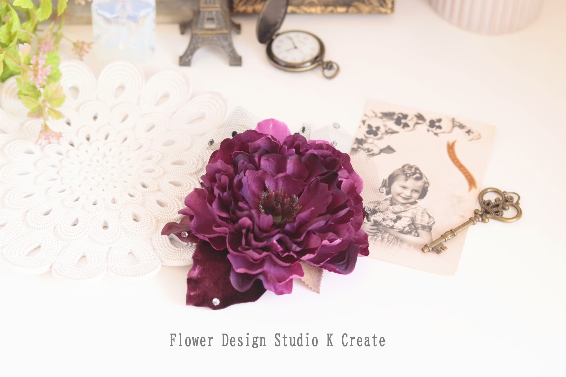 ダークパープルのピオニーと葉っぱのヘアクリップ フラメンコ ダンス 髪飾り ヘアクリップ 紫 パープル 発表会 ベロア チュール 着物 和装 袴 結婚式 舞台 フォーマル