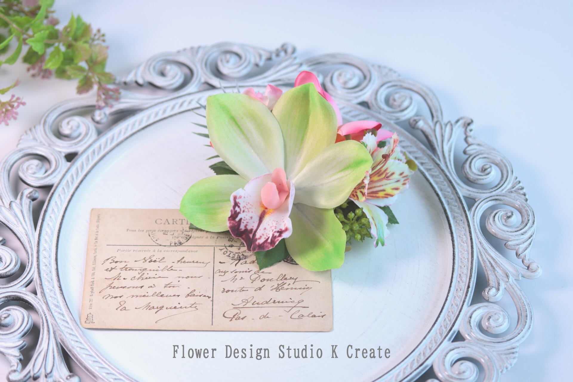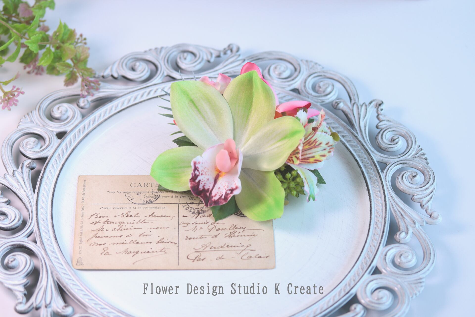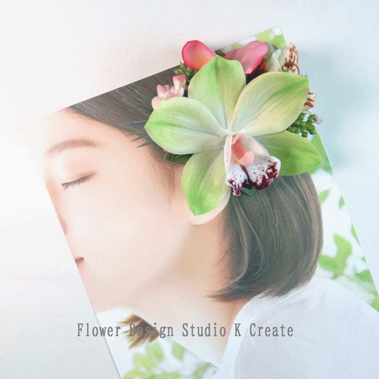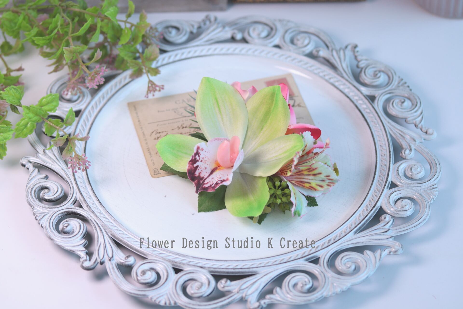 黄緑のシンビジュームとプルメリとアストロメリアのヘアクリップ トロピカル ハワイ フラダンス 浴衣髪飾り ウェディング リゾ婚 ハワイ グアム 沖縄 挙式 花嫁ヘア リゾ婚 ピンク フラダンス