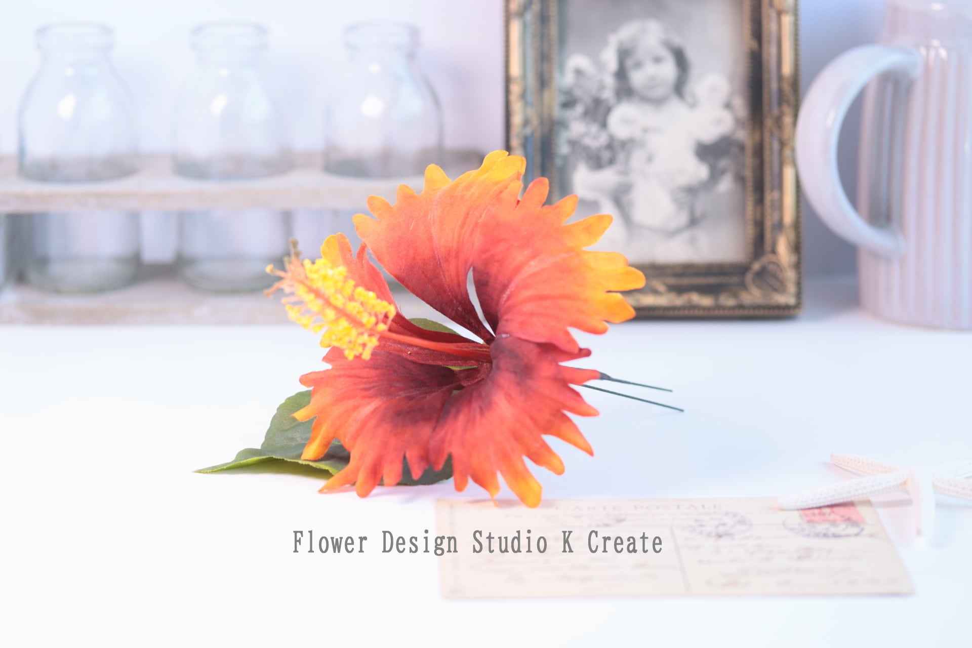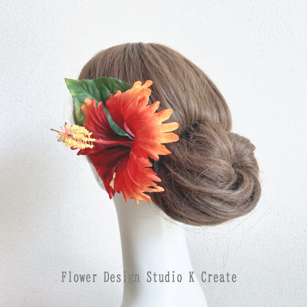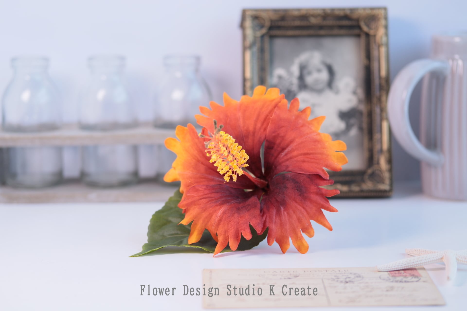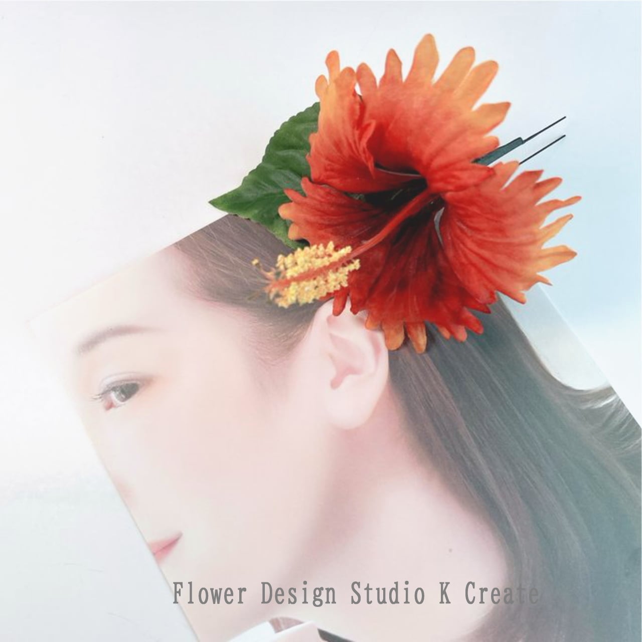 シンプルな茜色のハイビスカスの髪飾り オレンジレッド フラガール ダンス タヒチアンダンス ココ フラダンス ハイビスカス 造花 フラ 花飾り リゾ婚 ハワイ挙式