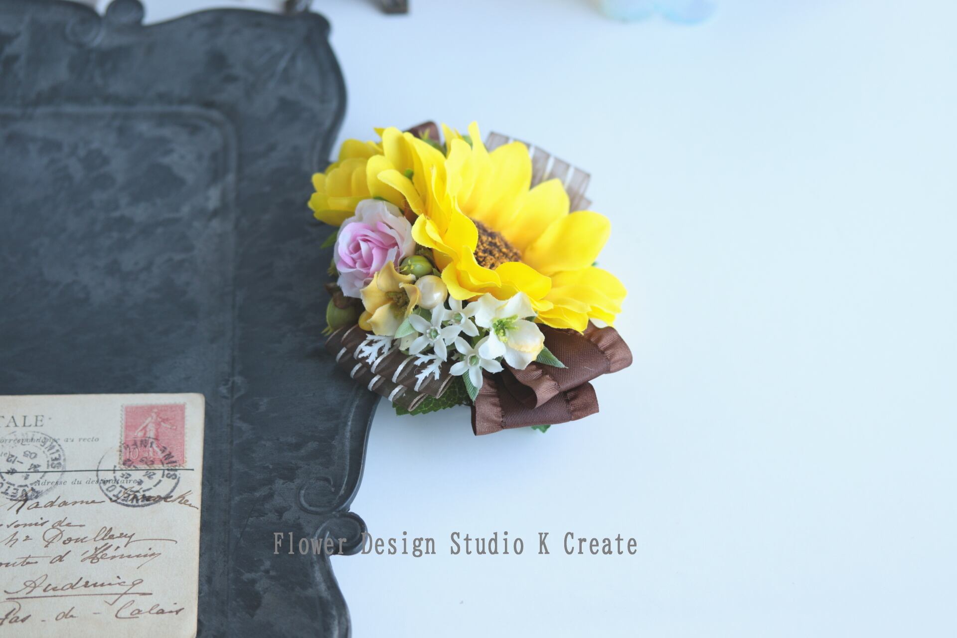 向日葵とピンクの薔薇のリボンヘアクリップ 向日葵 おでかけ 浴衣 髪飾り ヒマワリ ひまわり 浴衣髪飾り ブラウン 茶色 黄色