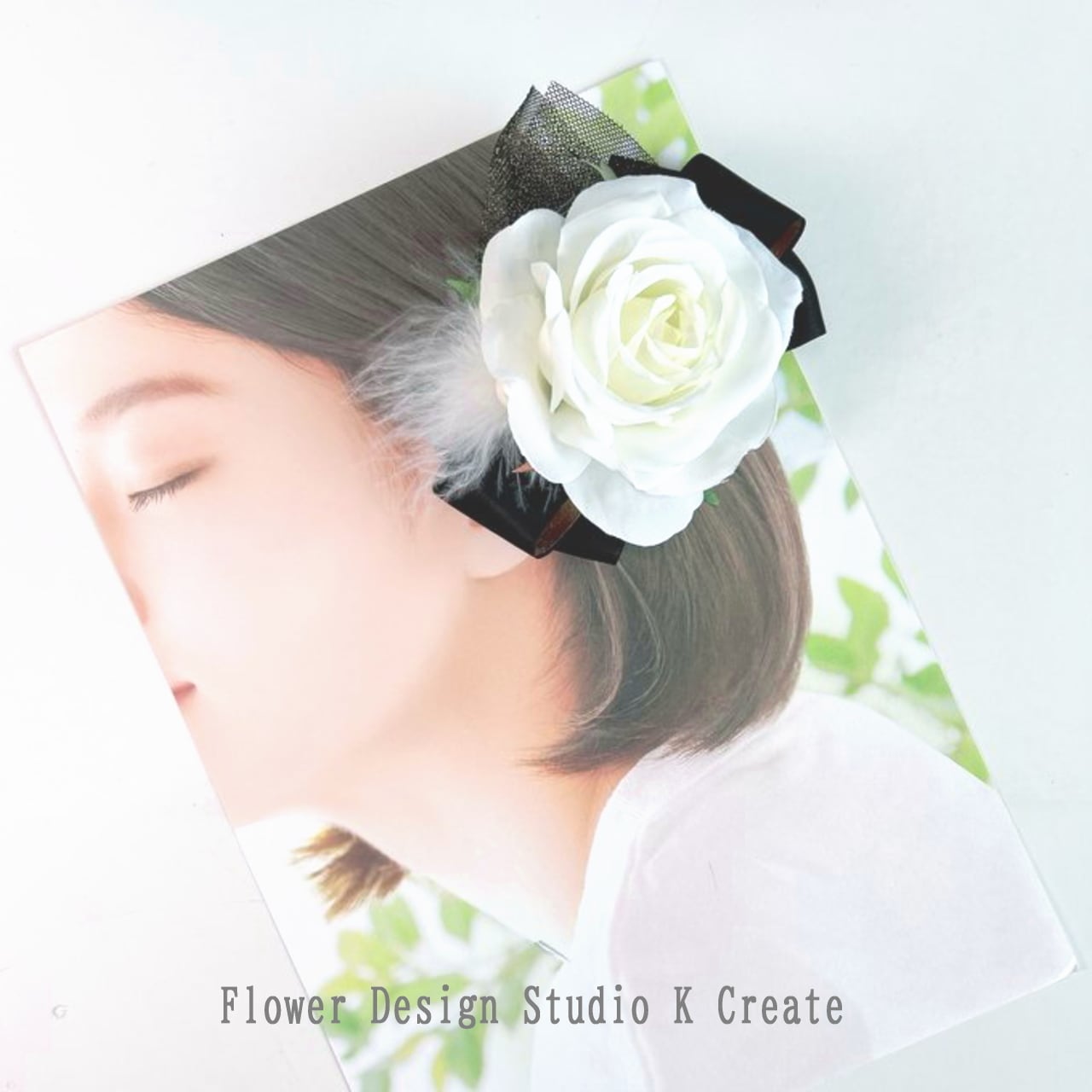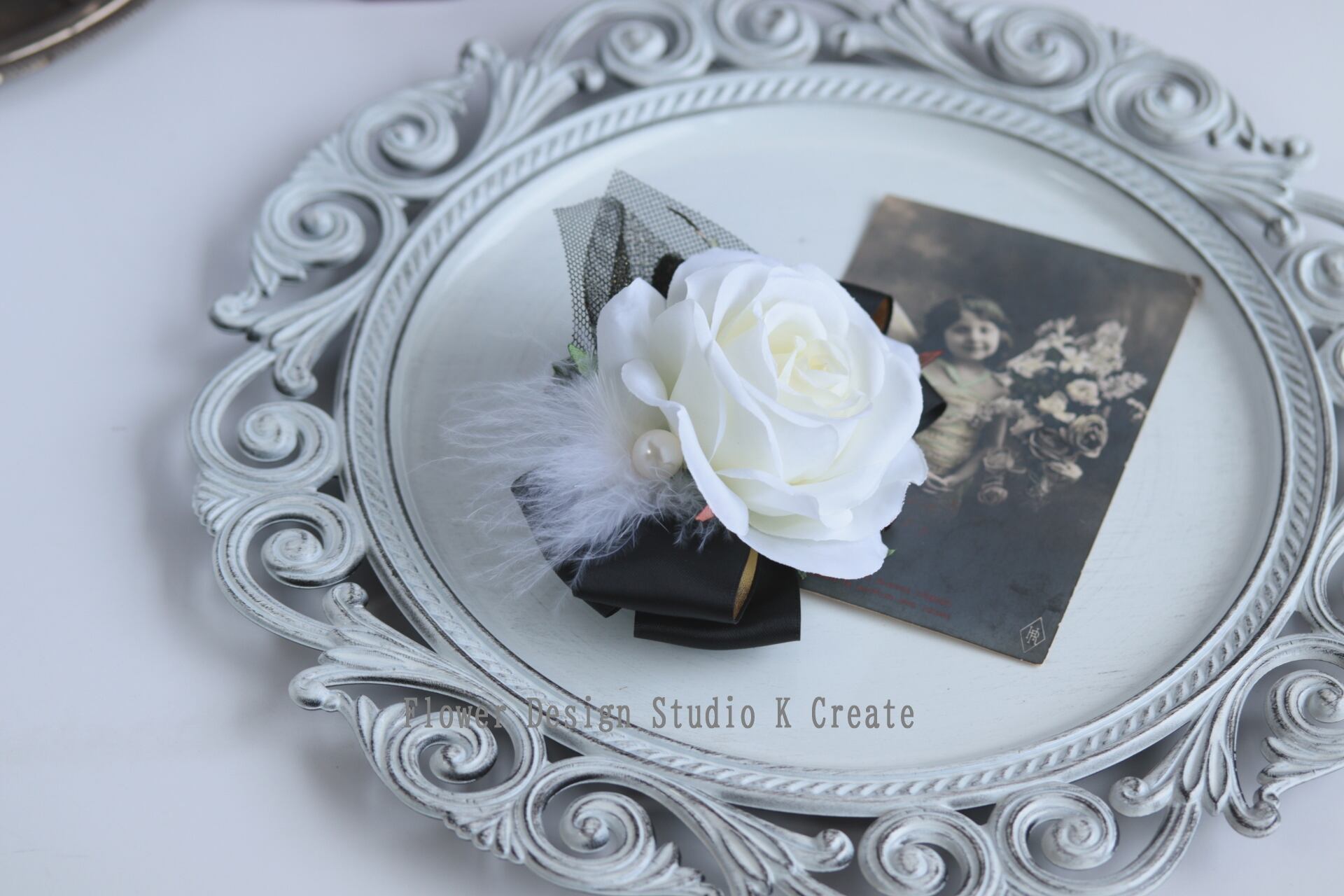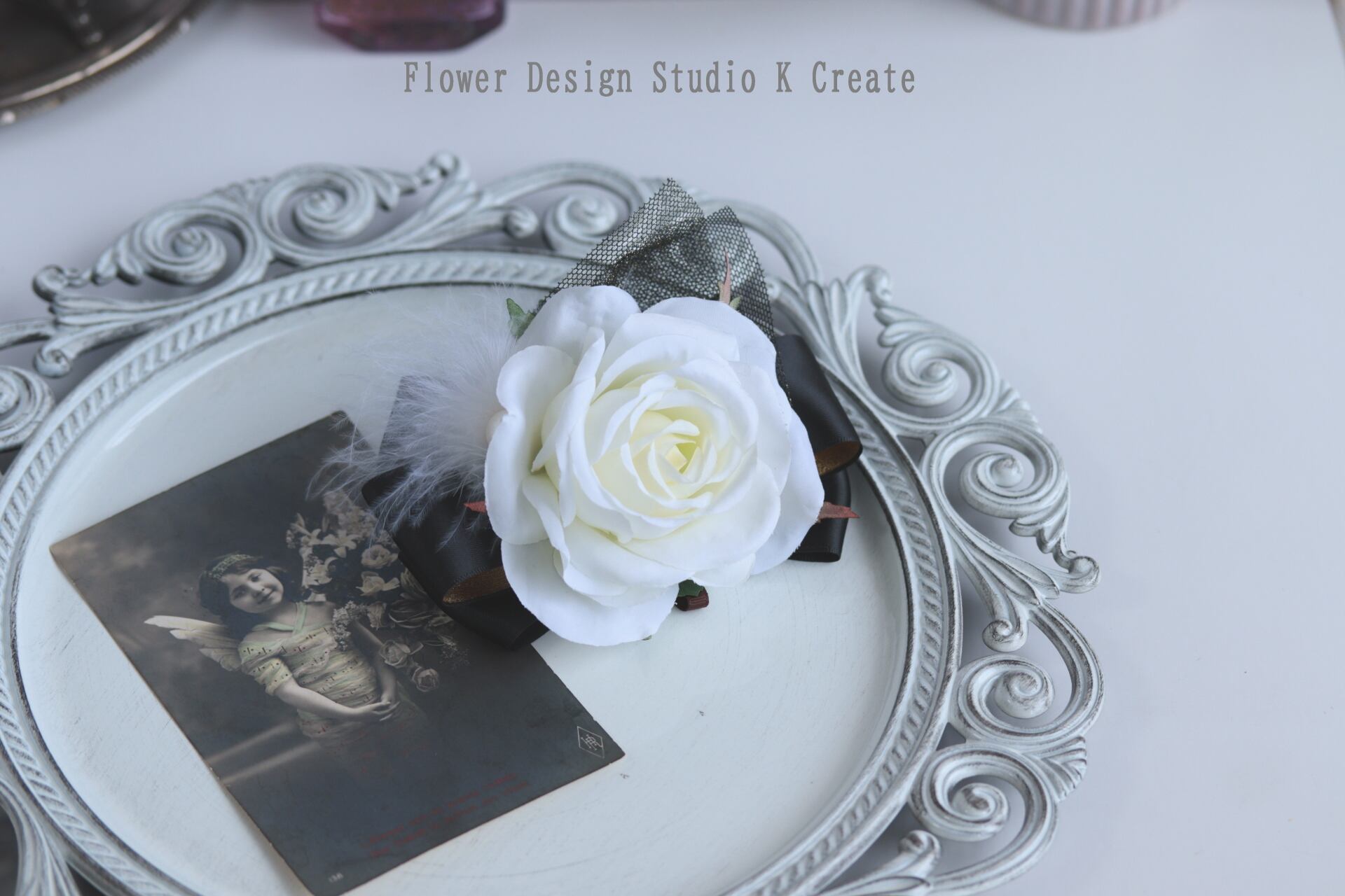 白い薔薇とふわふわの羽を添えた