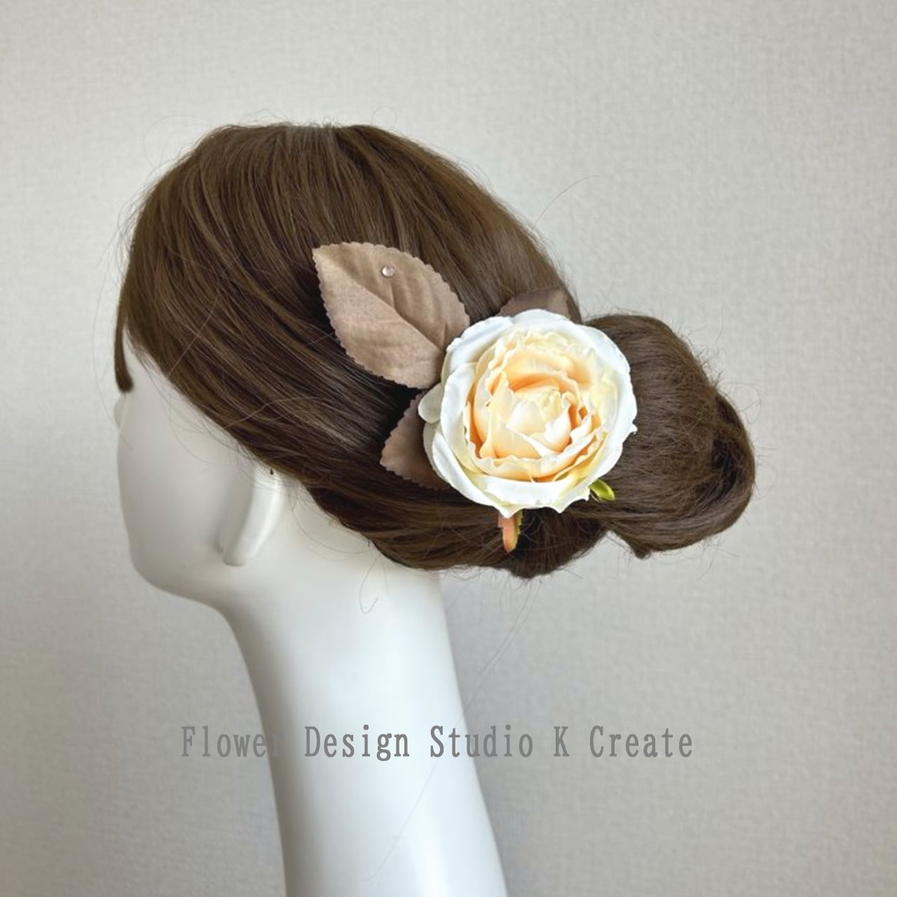 エクリュな薔薇と秋の葉の髪飾り フラメンコ フローレス 花径8cm エクリュ 薔薇 舞台 発表会 頭飾り 花飾り