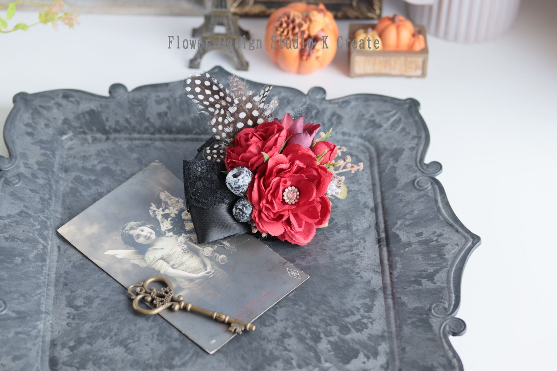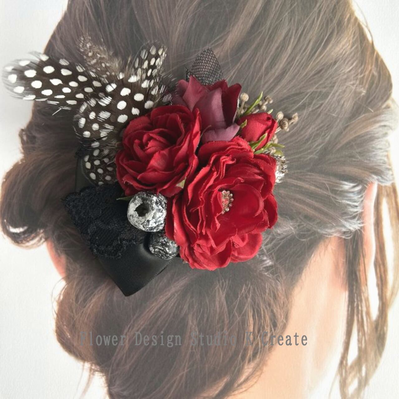 バレエ・フラメンコ・フローレス・発表会に♡赤い薔薇とユーカリの実のヘアクリップ 赤 秋色 ヘアクリップ バラ 羽 髪飾り ダンス 発表会