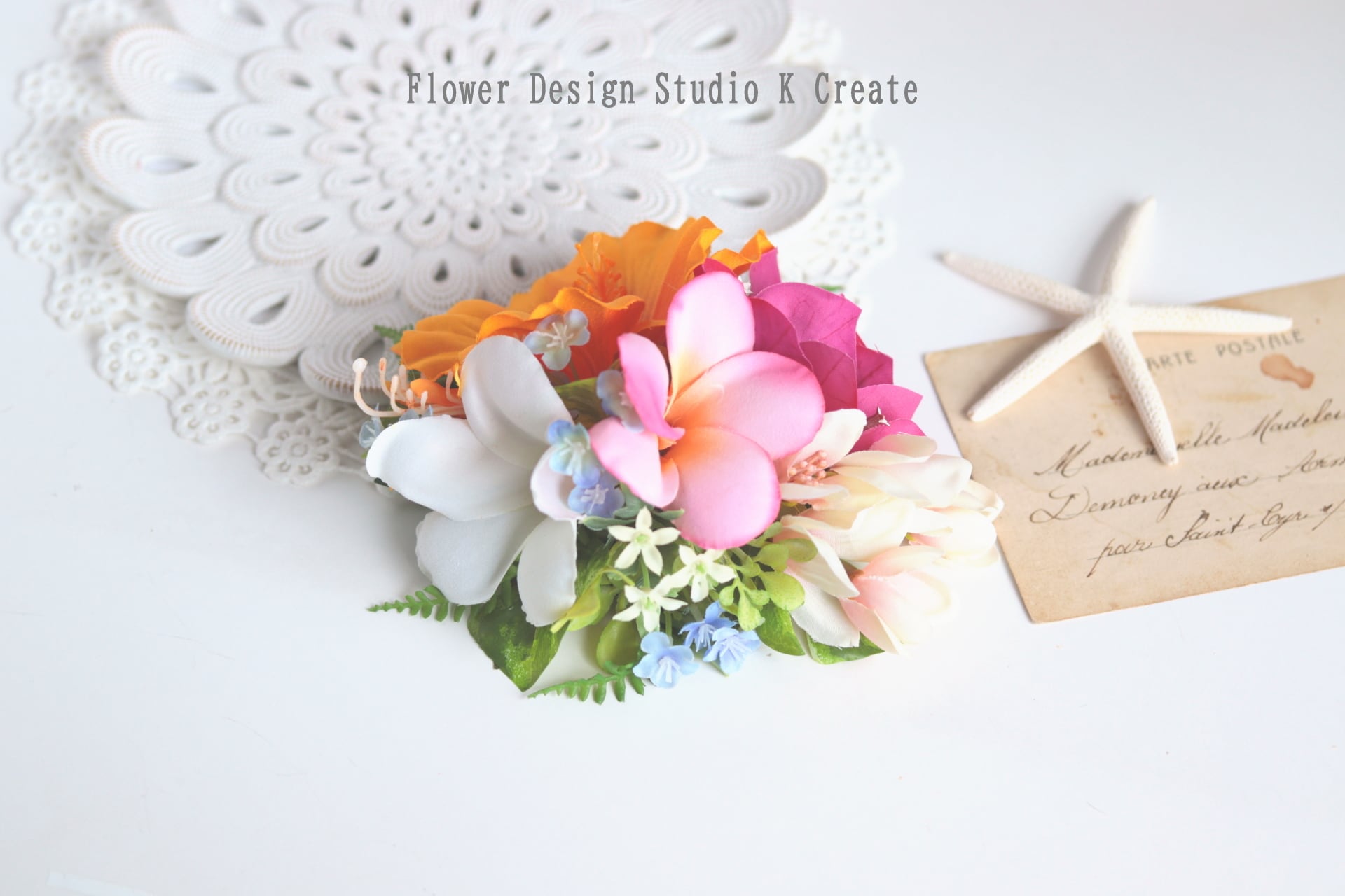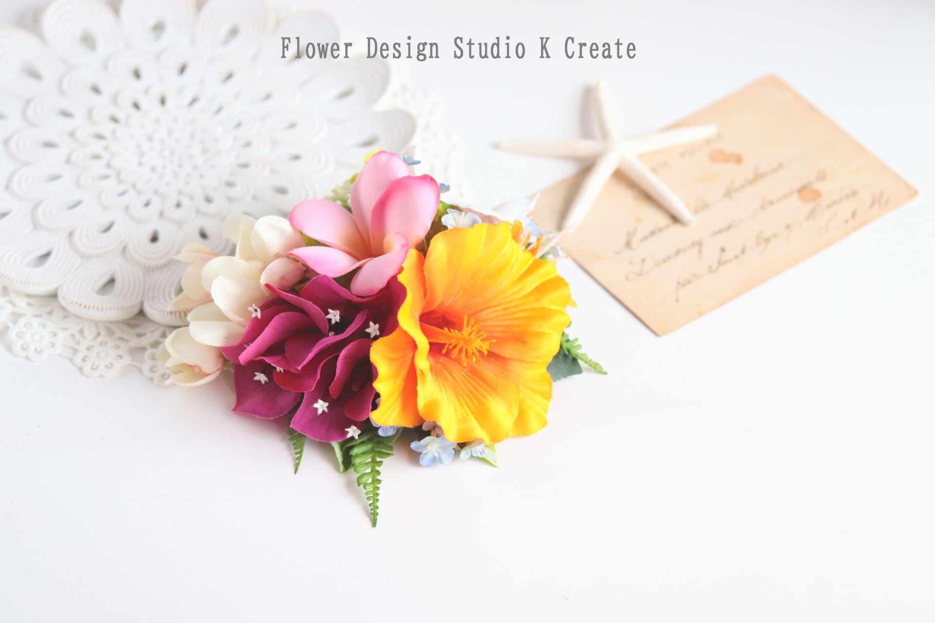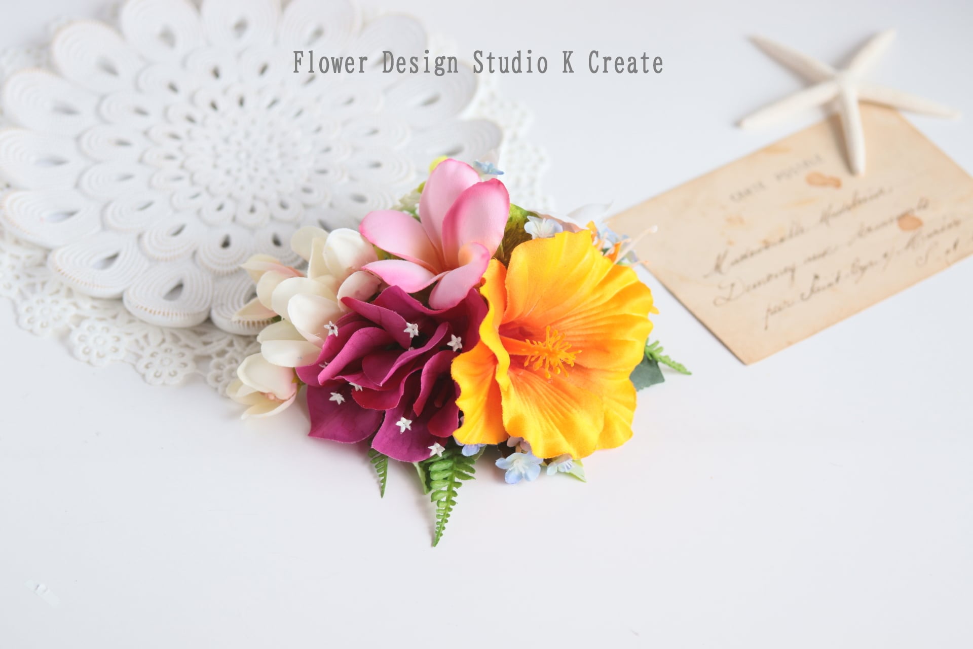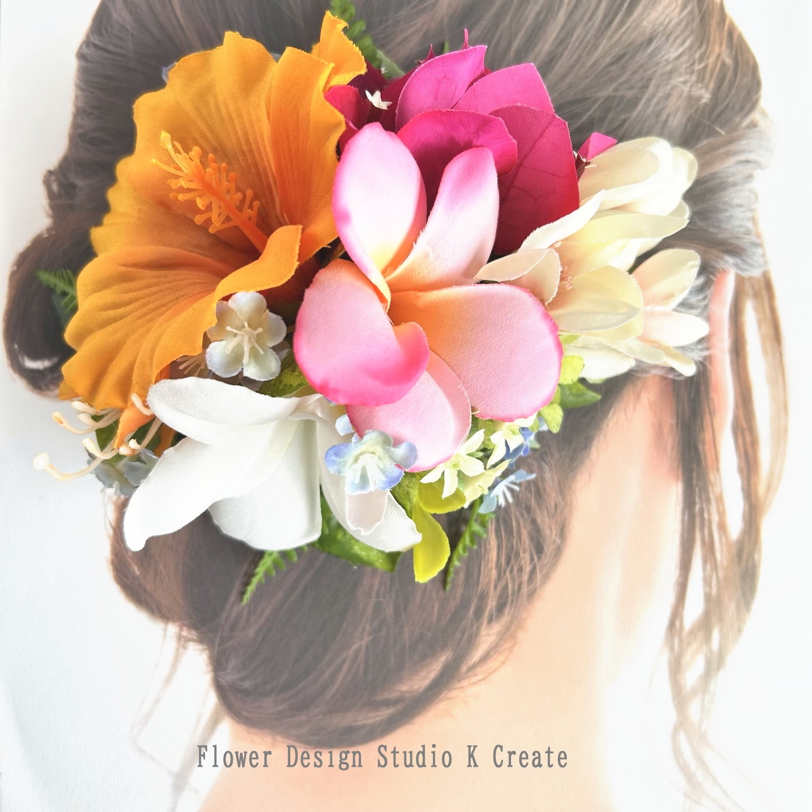 オレンジのハイビスカスとピンクのプルメリアのヘアクリップ フラダンス フラ リゾ婚 ウェディング 海外挙式 結婚式 ハワイ挙式 ウェディングフォト 前撮り 後撮り ハイビスカス プルメリア 髪飾り