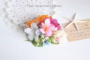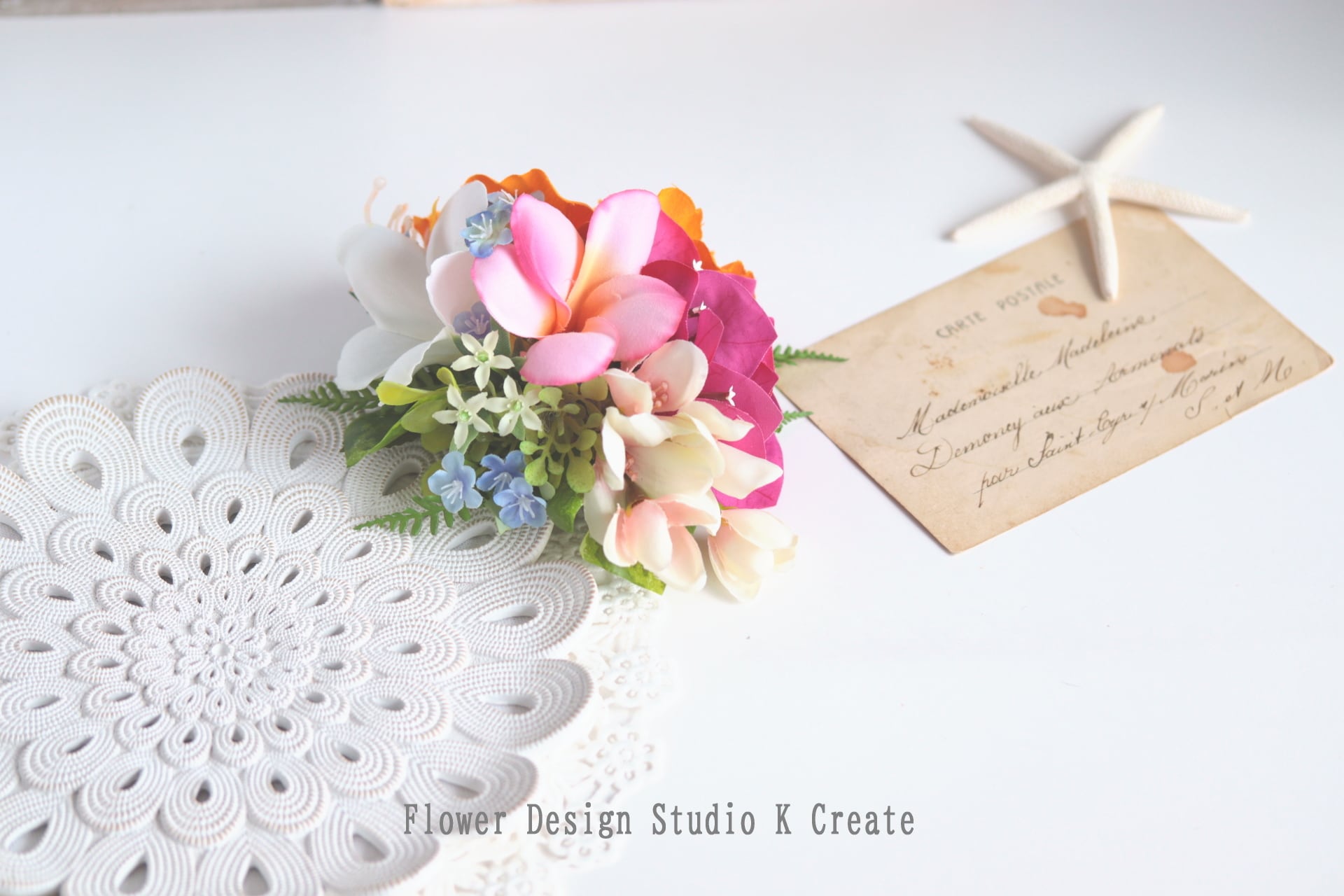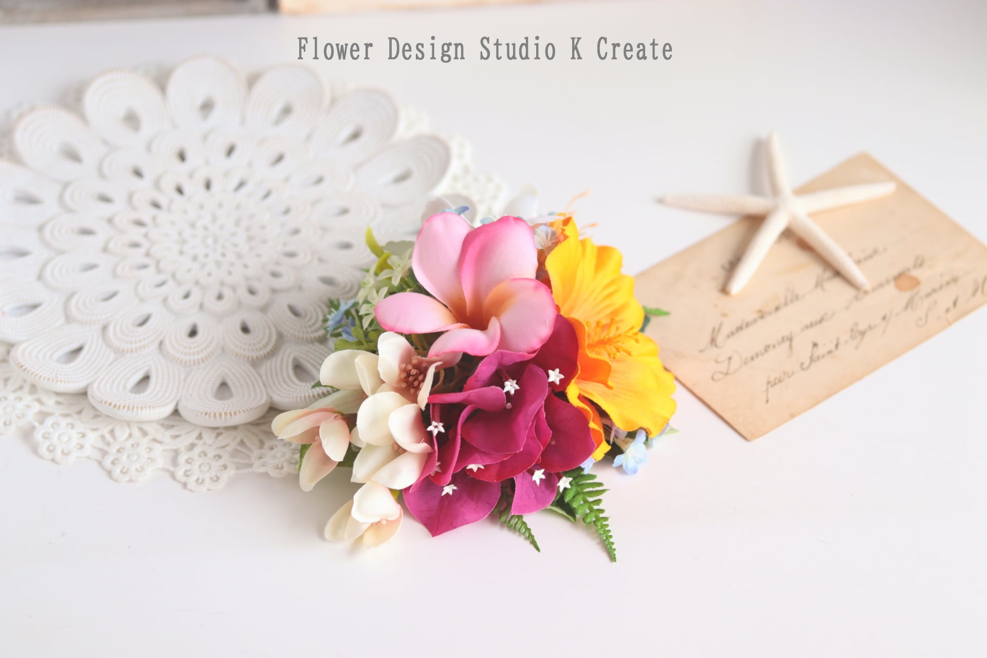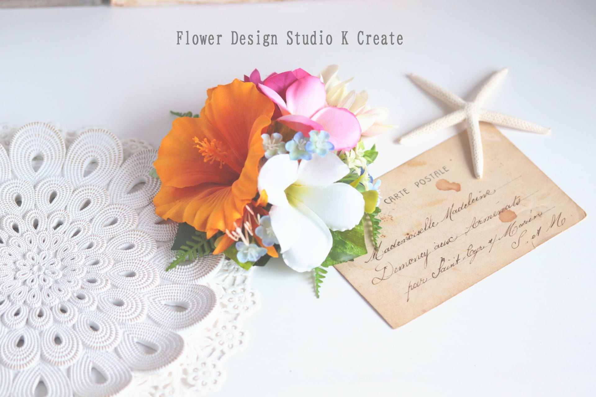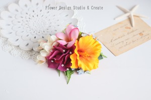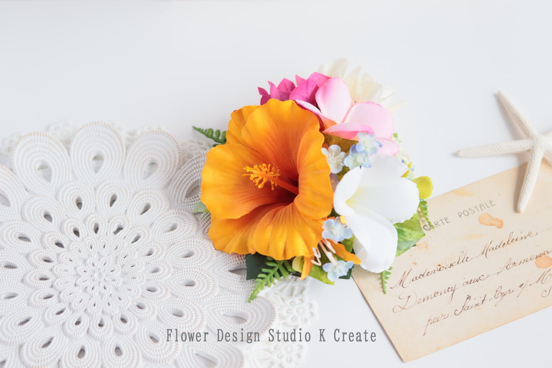 オレンジのハイビスカスとピンクのプルメリアのヘアクリップ フラダンス フラ リゾ婚 ウェディング 海外挙式 結婚式 ハワイ挙式 ウェディングフォト 前撮り 後撮り ハイビスカス プルメリア 髪飾り