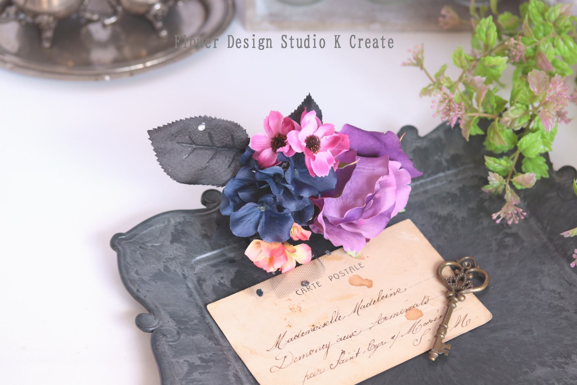パーティー・フォーマル・ダンス髪飾りに♡紫の薔薇とネイビーの紫陽花と小花のアレンジUピン ハロウィン パーティー 袴 着物 ダンス 髪飾り チュール 黒 コスモス 紫 フラメンコ