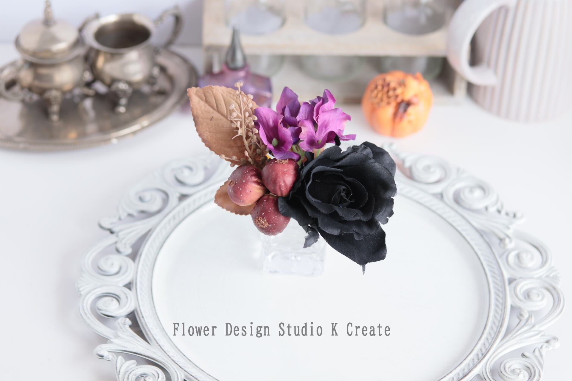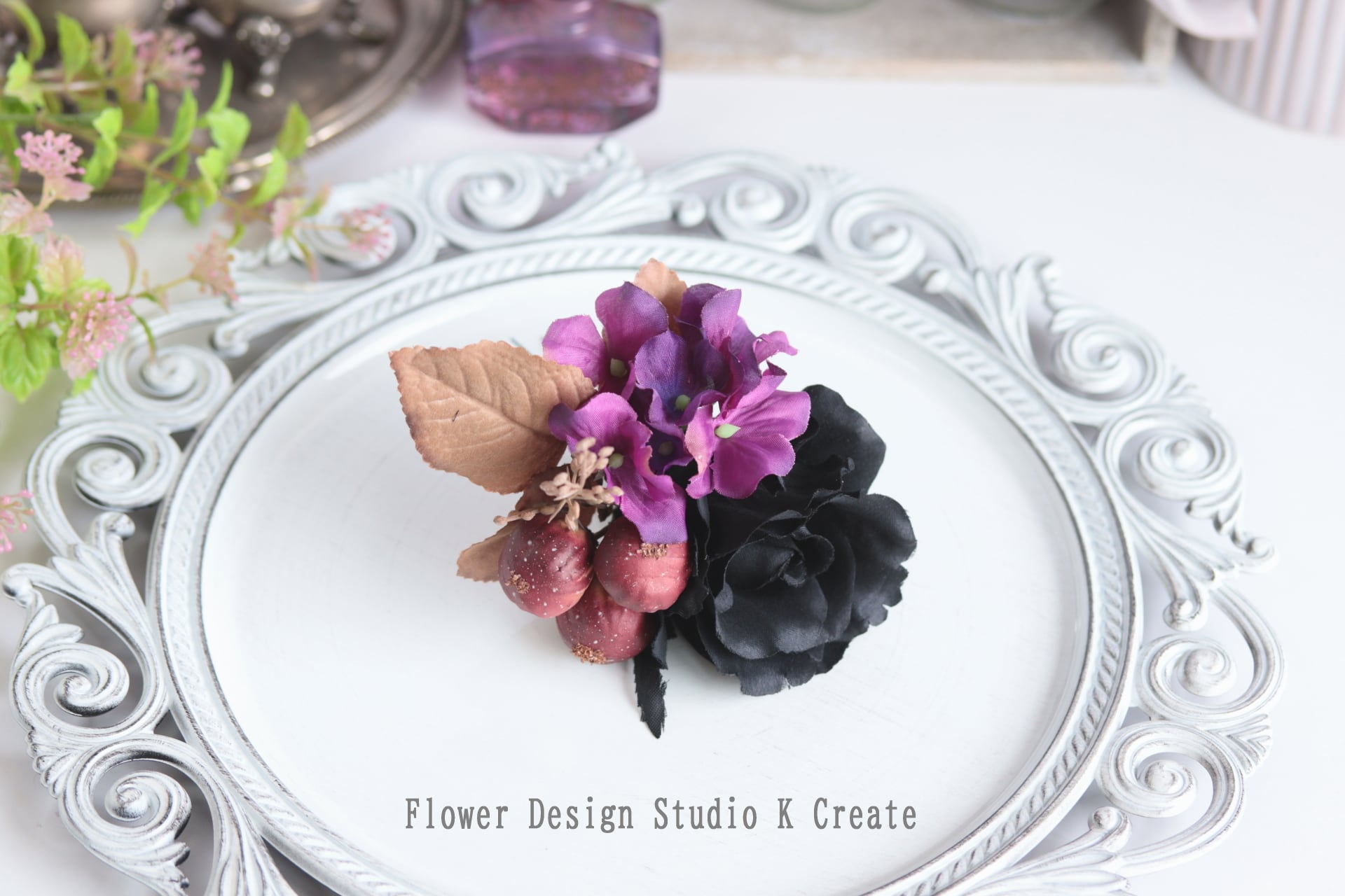 パーティー・フォーマル・ダンス髪飾りに♡黒い薔薇とパープルの紫陽花とイチジクのアレンジUピン ハロウィン パーティー 袴 着物 ダンス 髪飾り チュール 黒 黒い薔薇 紫陽花 イチジク 紫 フラメンコ