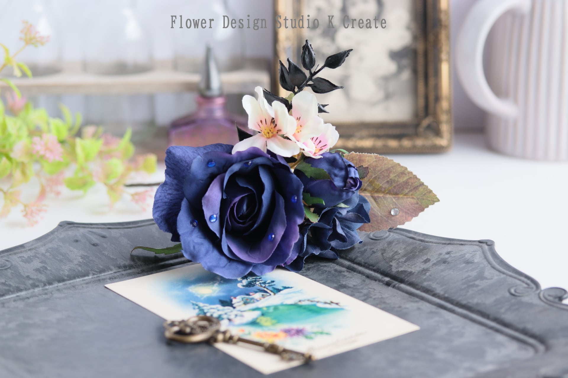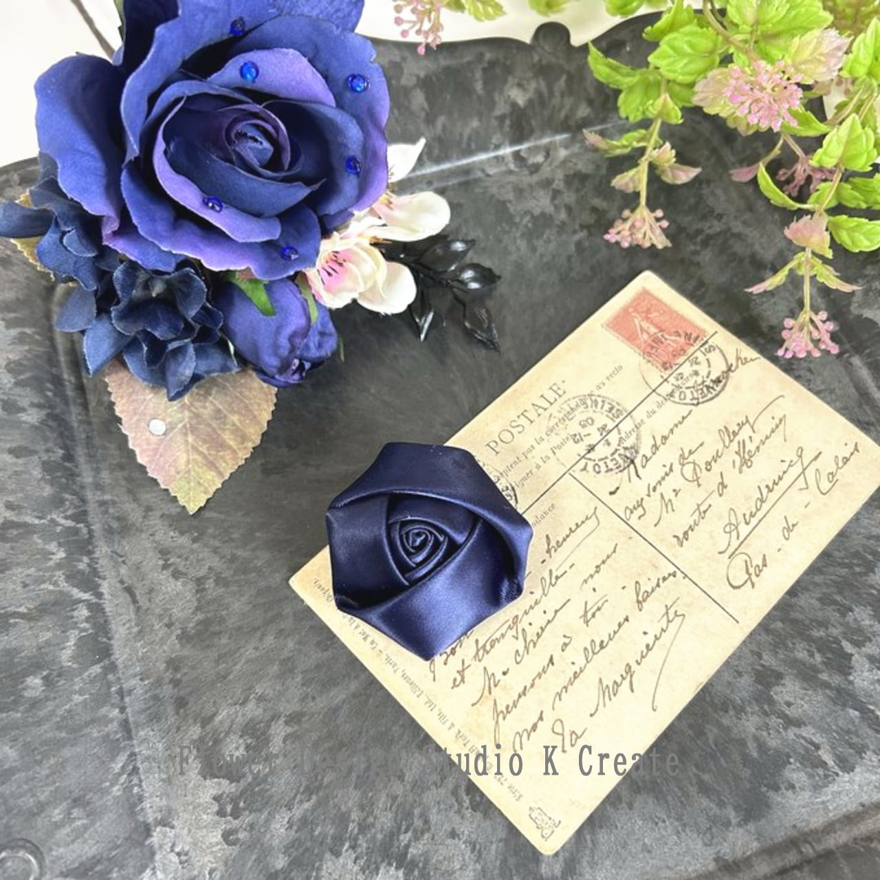 ネイビーの薔薇のフローレスとリボンローズのシージョ留め 髪飾り ダンス フローレス フラメンコ 青 紺 ネイビー シージョ留め 青い薔薇 ブローチ