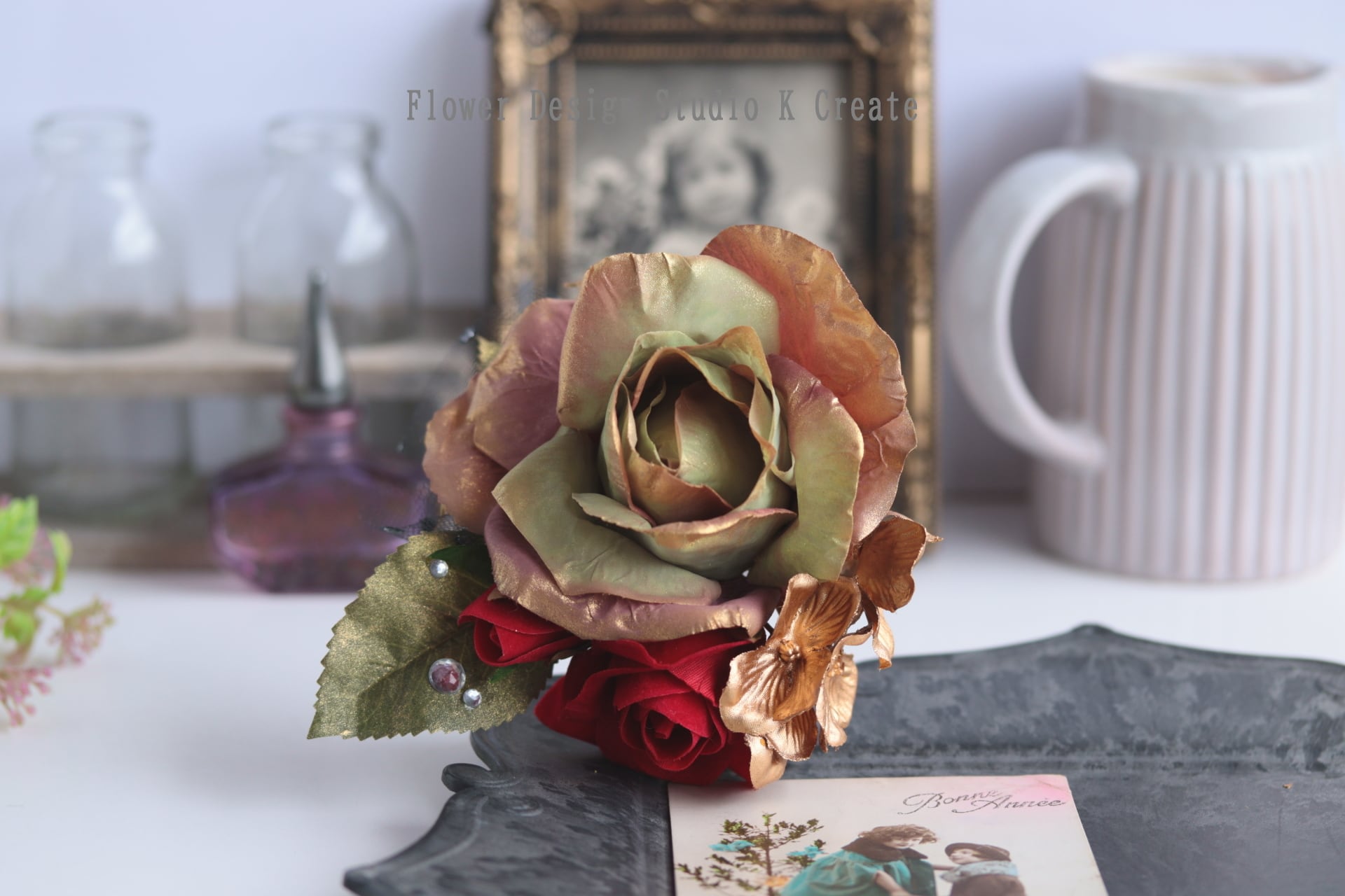 ピンクゴールドの薔薇と赤い薔薇の髪飾り(B) ライトストーン フラメンコ フローレス バラ ゴールド アジサイ バラ 髪飾り ダンス フォーマル パーティー
