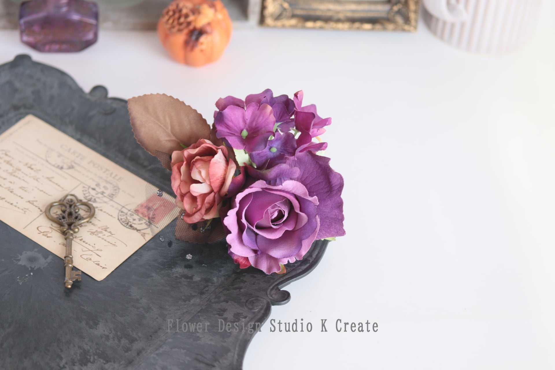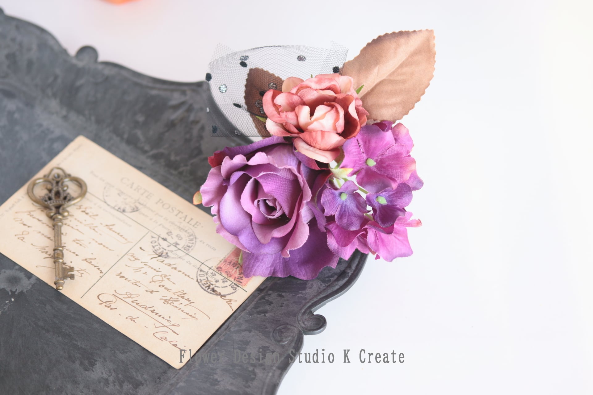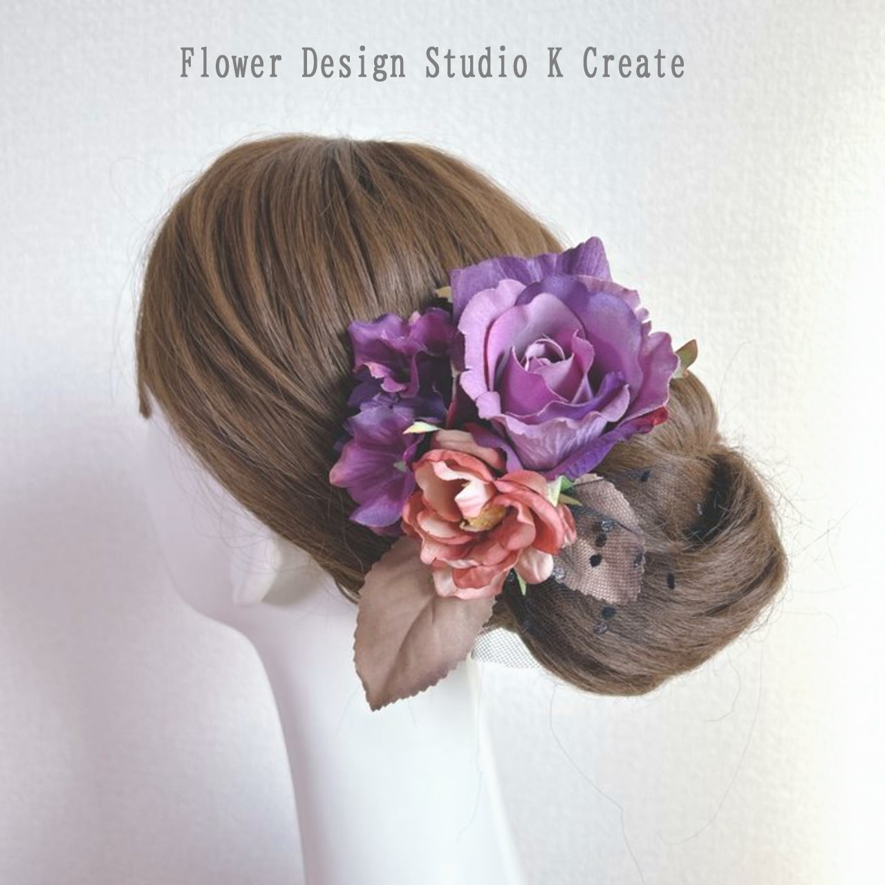 パープルの薔薇と秋薔薇の髪飾り フラメンコ フローレス ダンス 髪飾り チュール 発表会 秋 パープル 紫 バラ ダンス 髪飾り ハロウィン 秋色