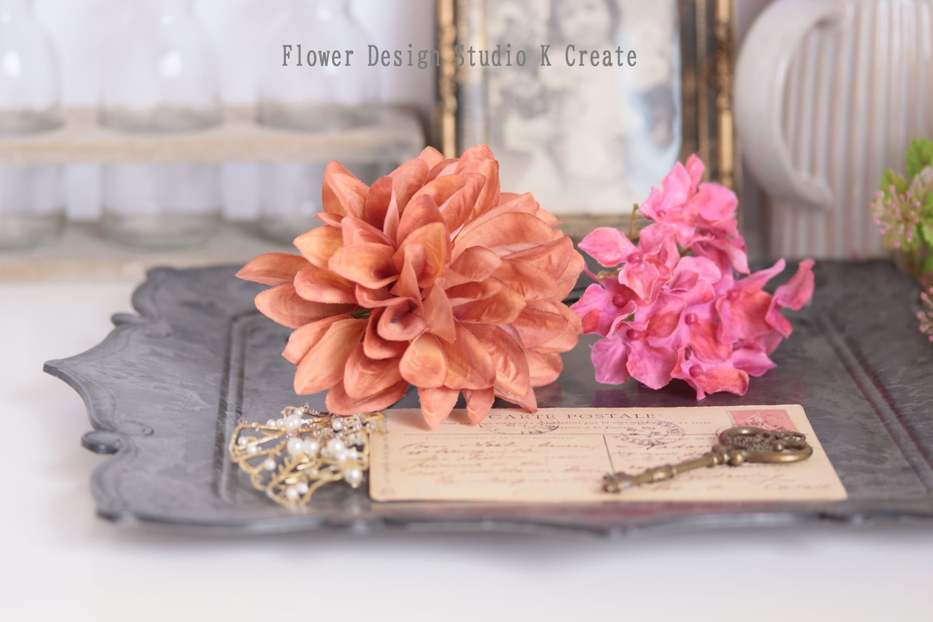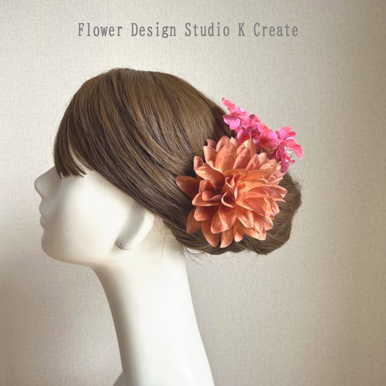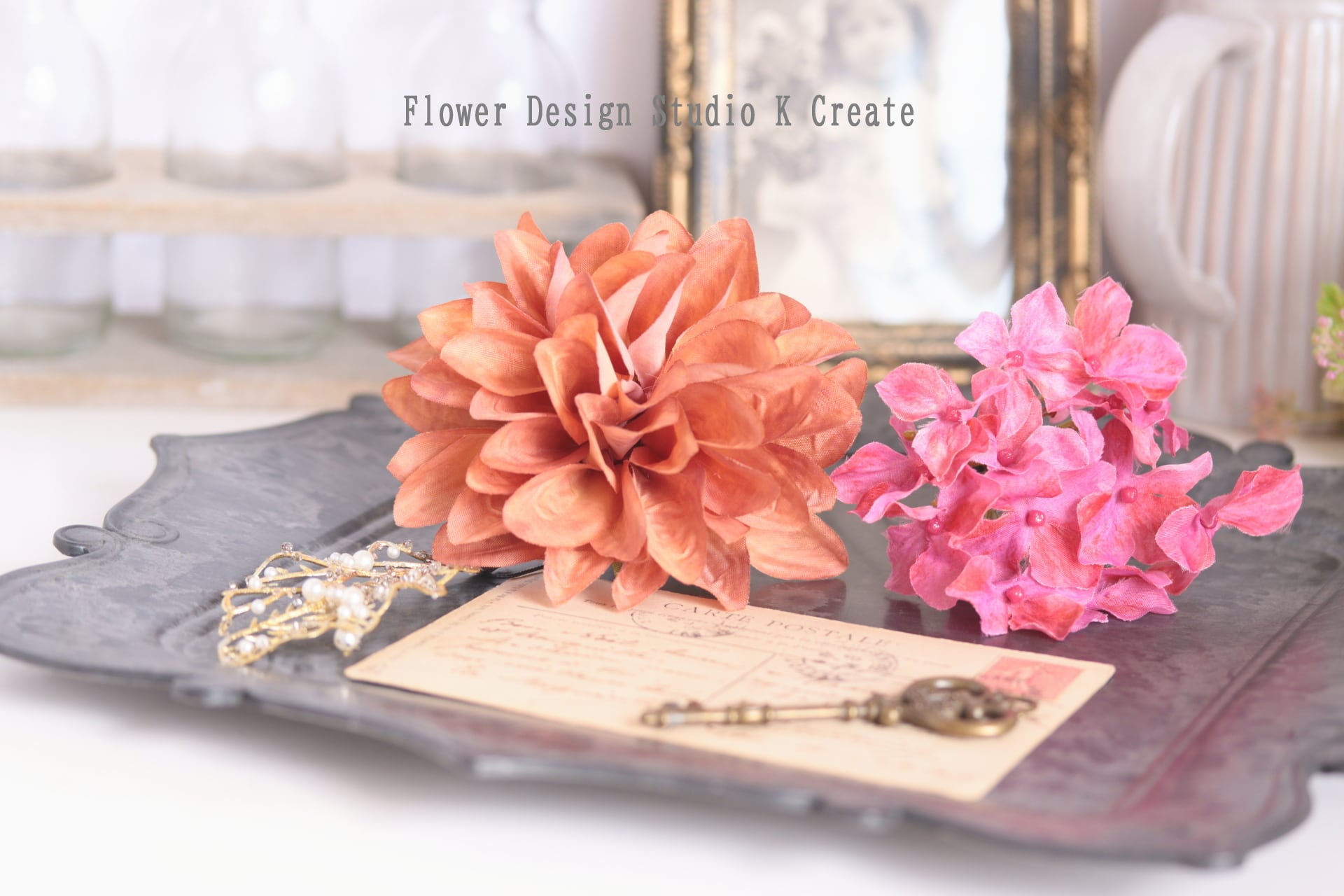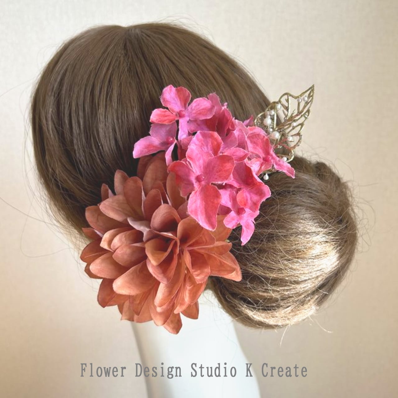 テラコッタのダリアとピンクの紫陽花の髪飾り フラメンコ ダンス フォーマル 結婚式 袴 髪飾り 花飾り フローレス ビジュー 入学式 卒業式 成人式 テラコッタ