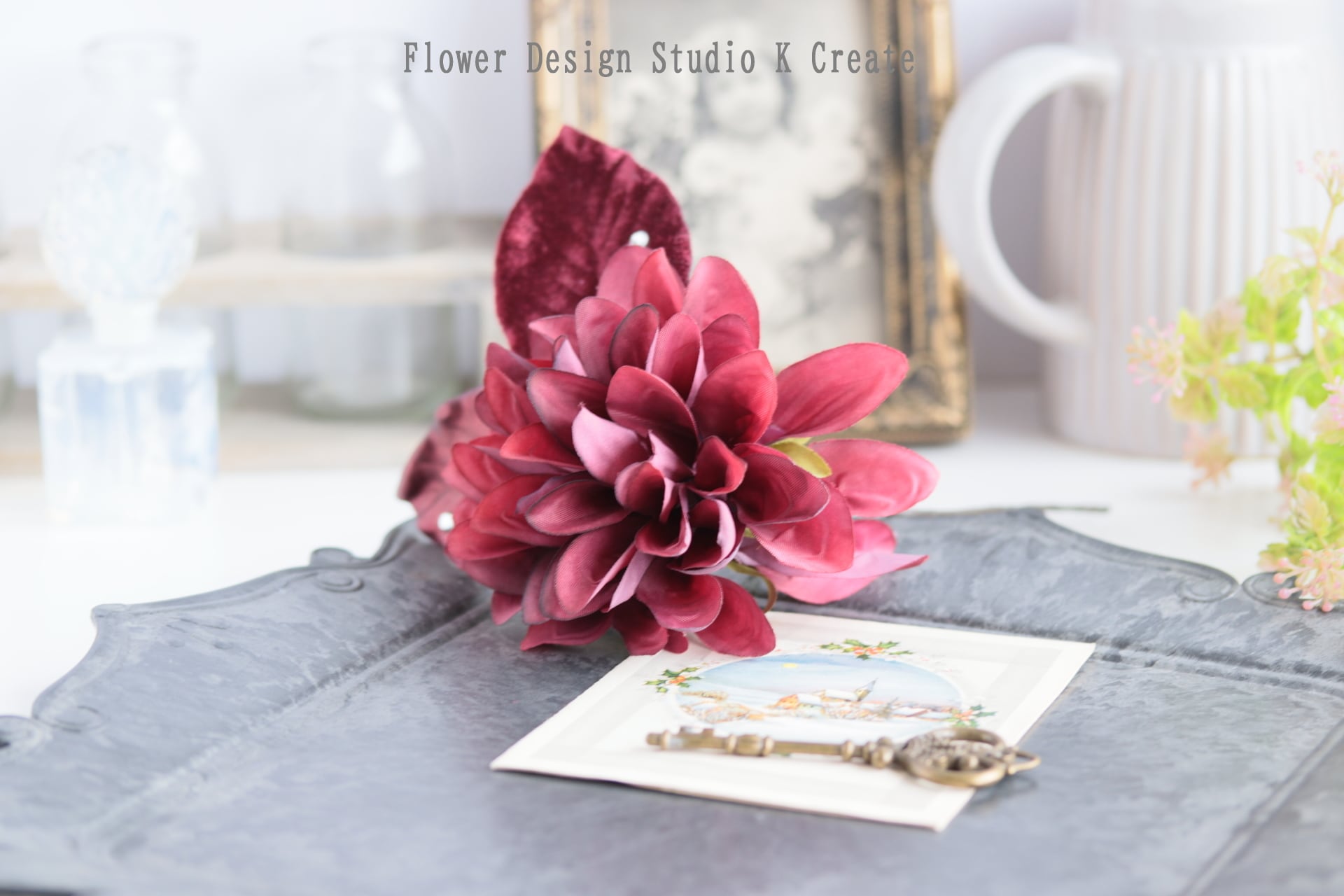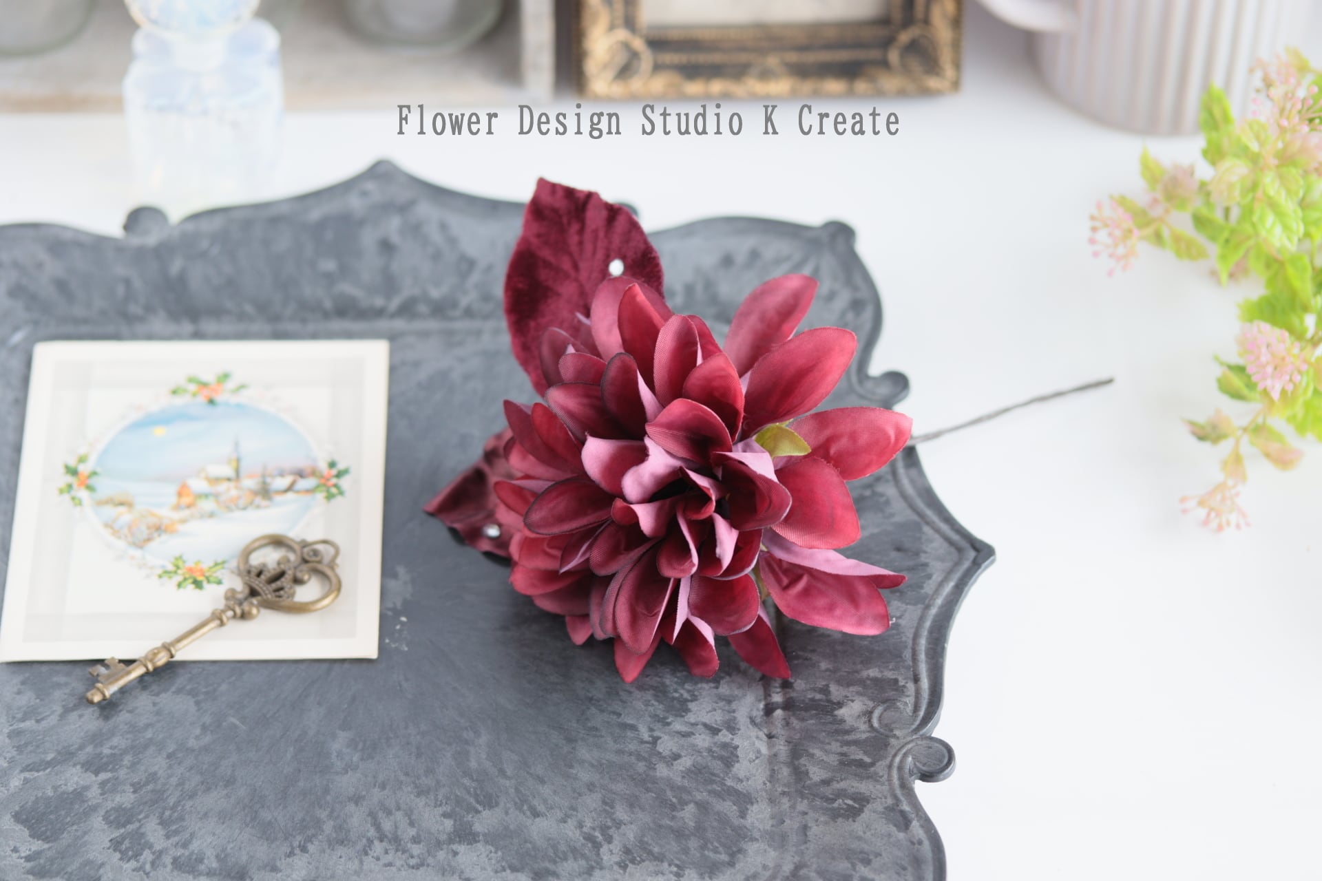 #ダリアの髪飾り #ピンクの紫陽花 #ボルドーのダリア