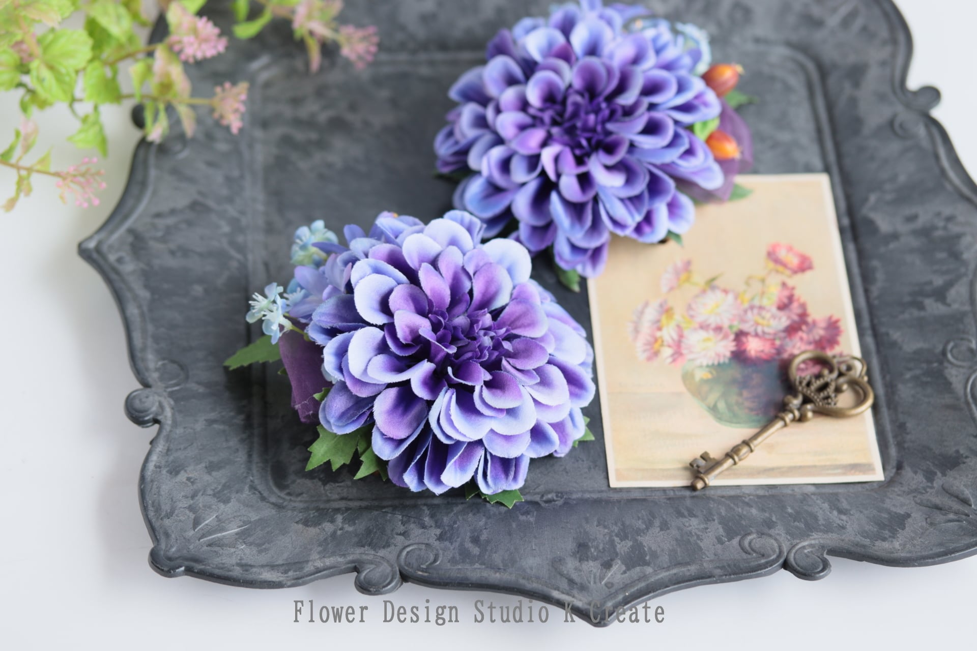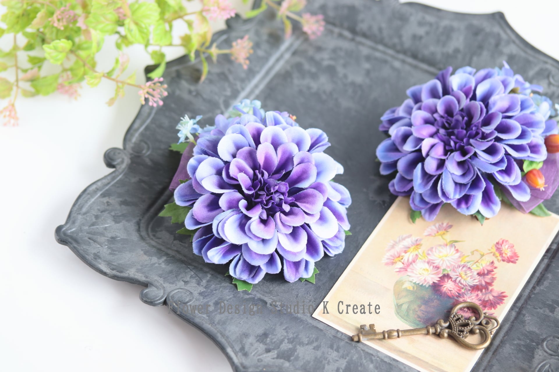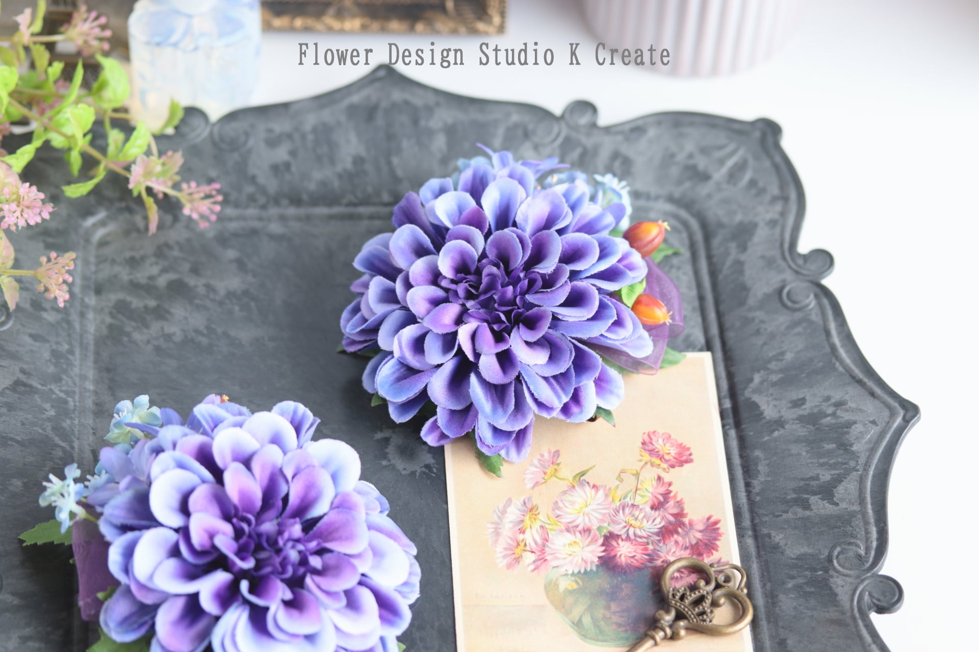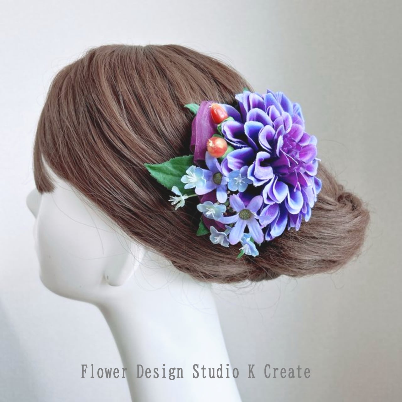 青紫のダリアとヒペリカムのヘアクリップ 青 紫 成人式 卒業袴 訪問着 髪飾り ヘッドドレス イベント 浴衣 ヘアクリップ 着物 和装 ブルー パープル