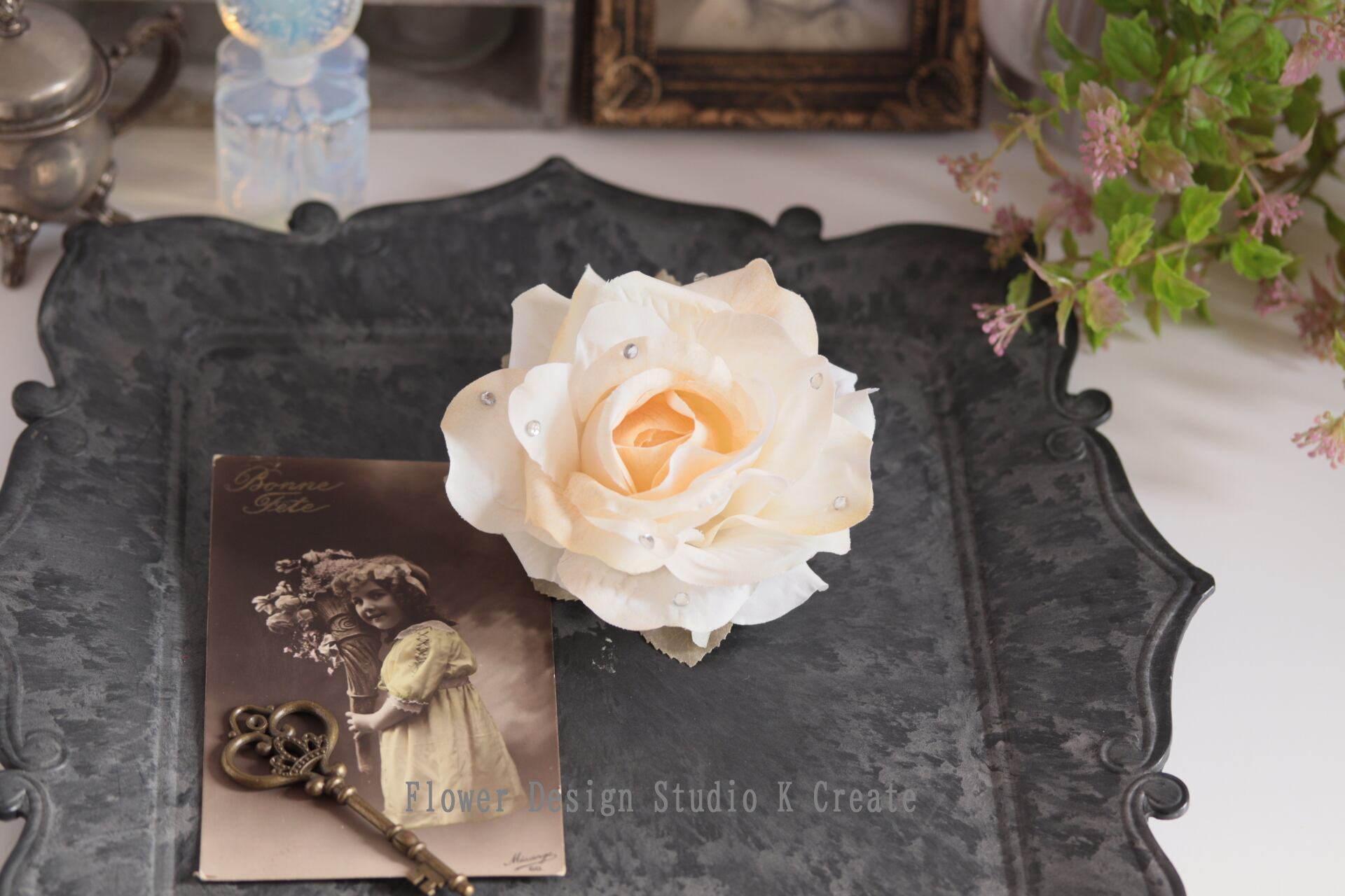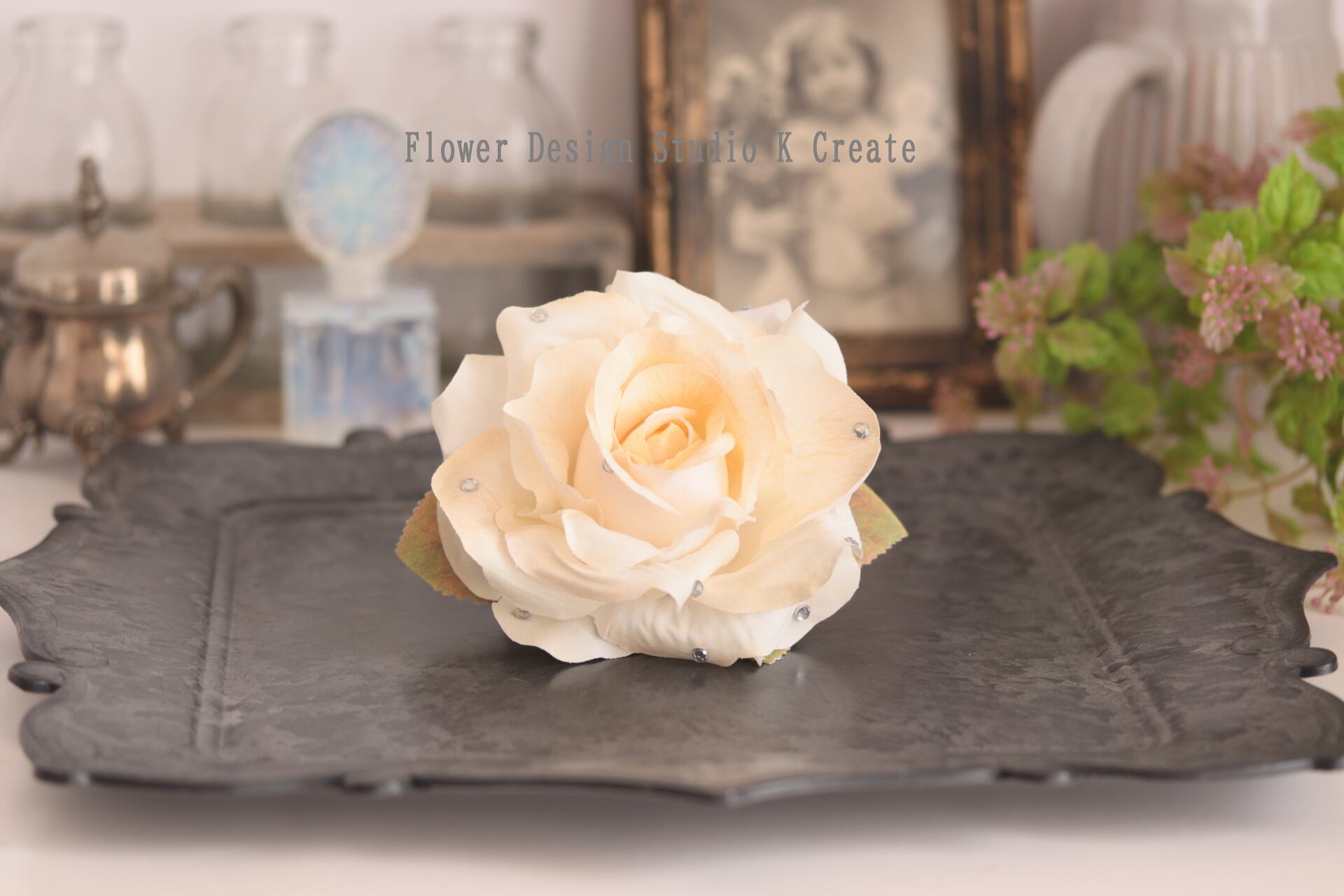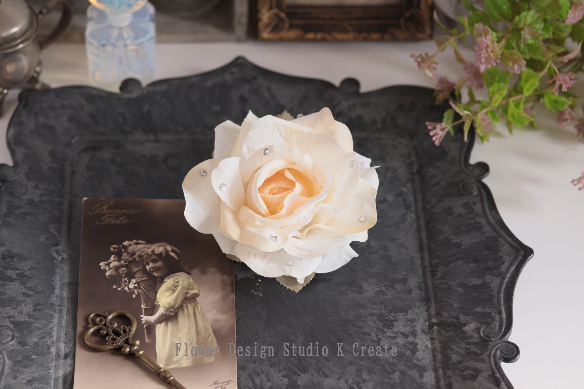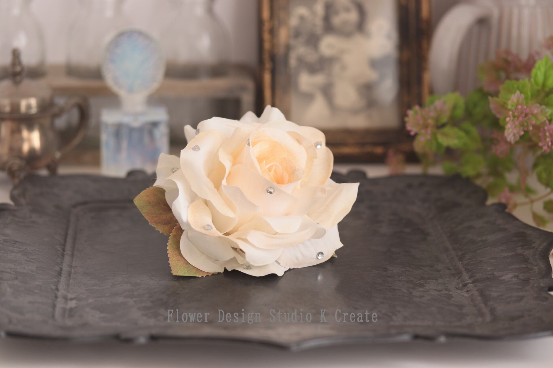 ライトストーンのついたエクリュローズのヘアクリップ フラメンコ バレエ 花径11~12cm エクリュ 薔薇 ヘアクリップ 髪飾り バラ 頭飾り 花飾り