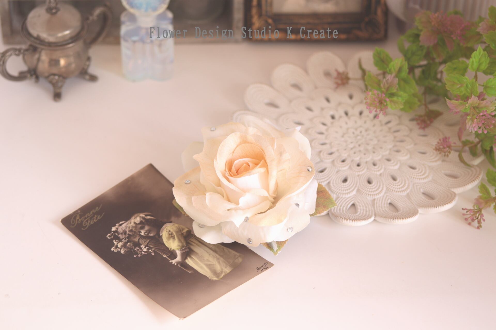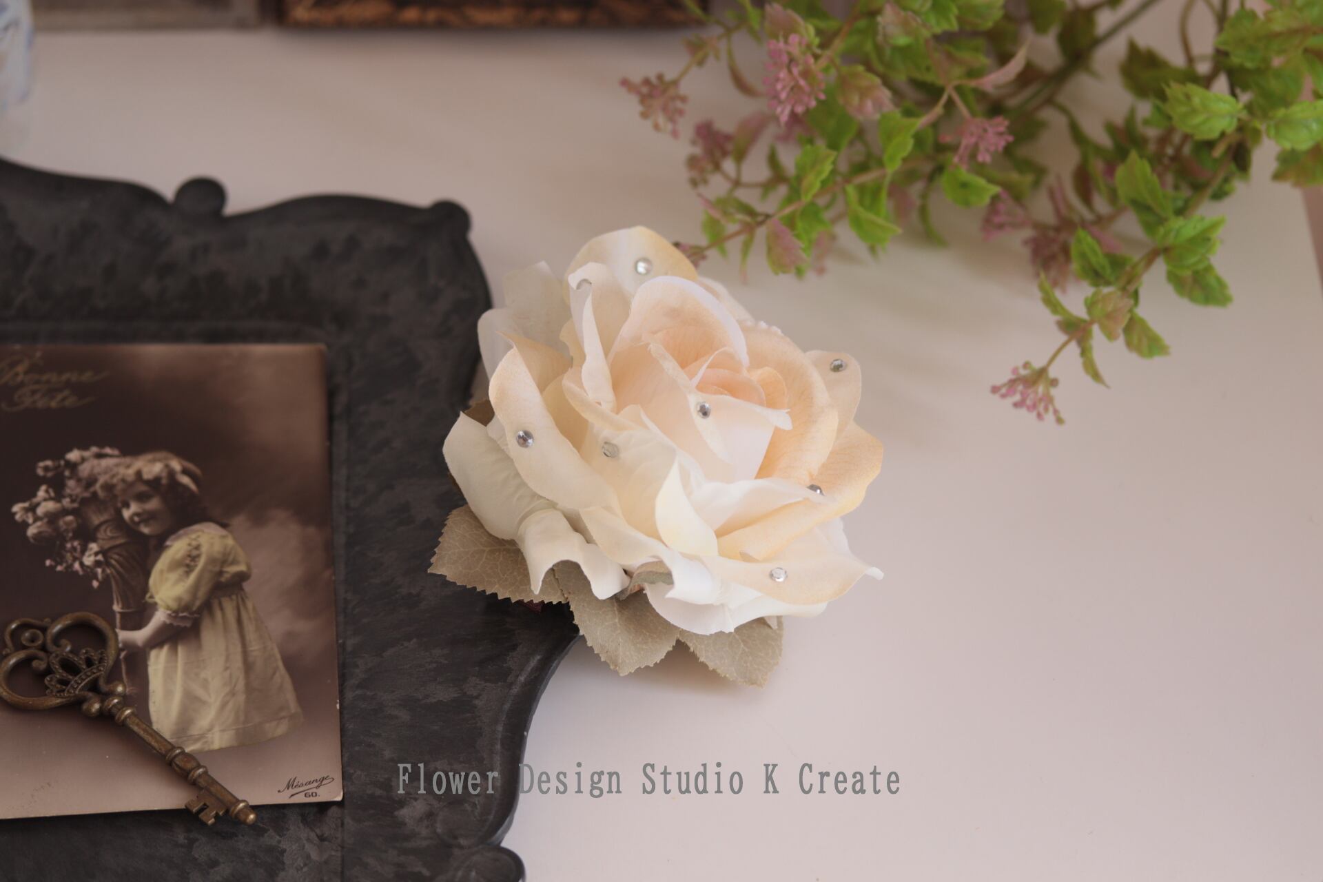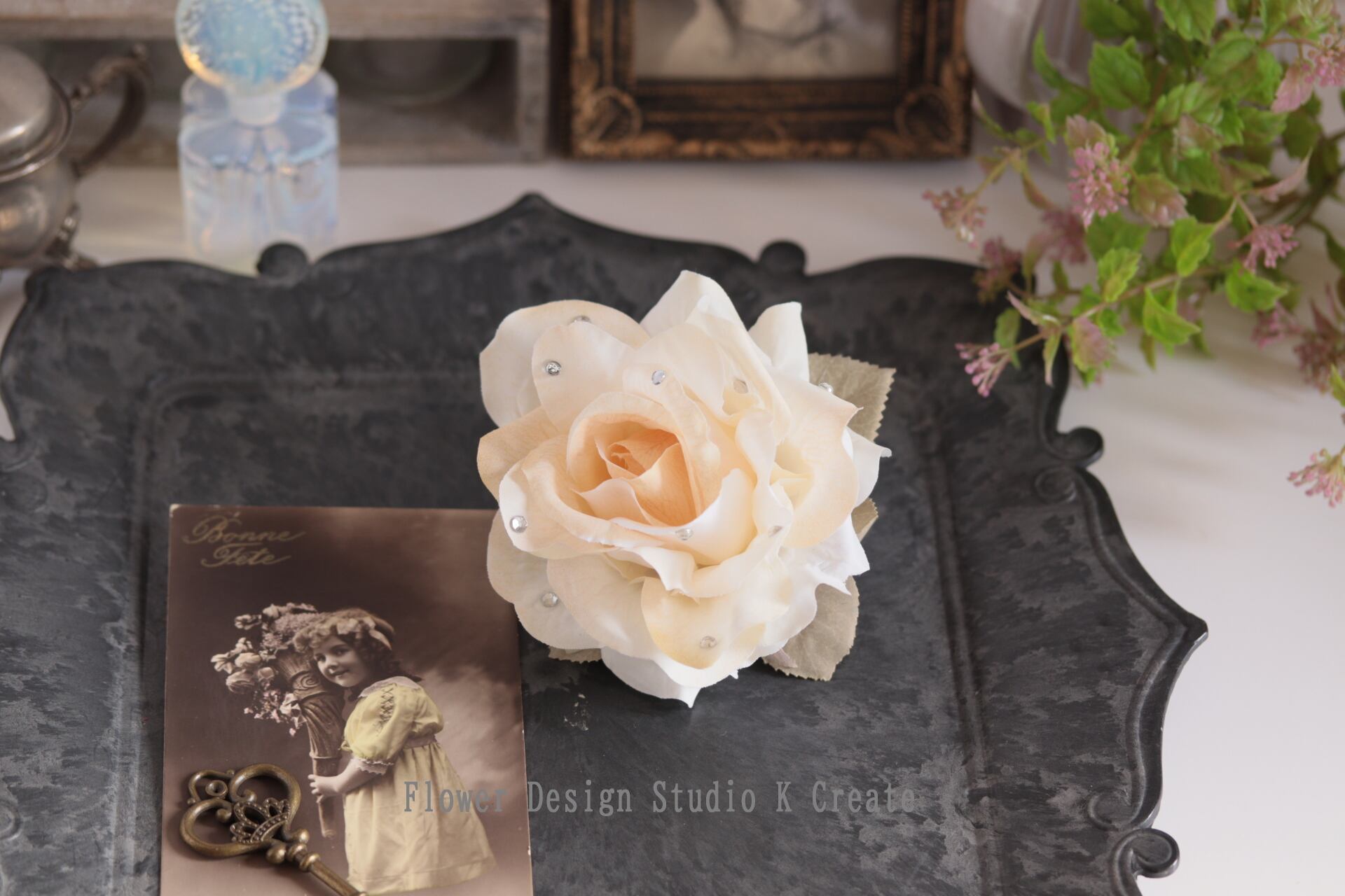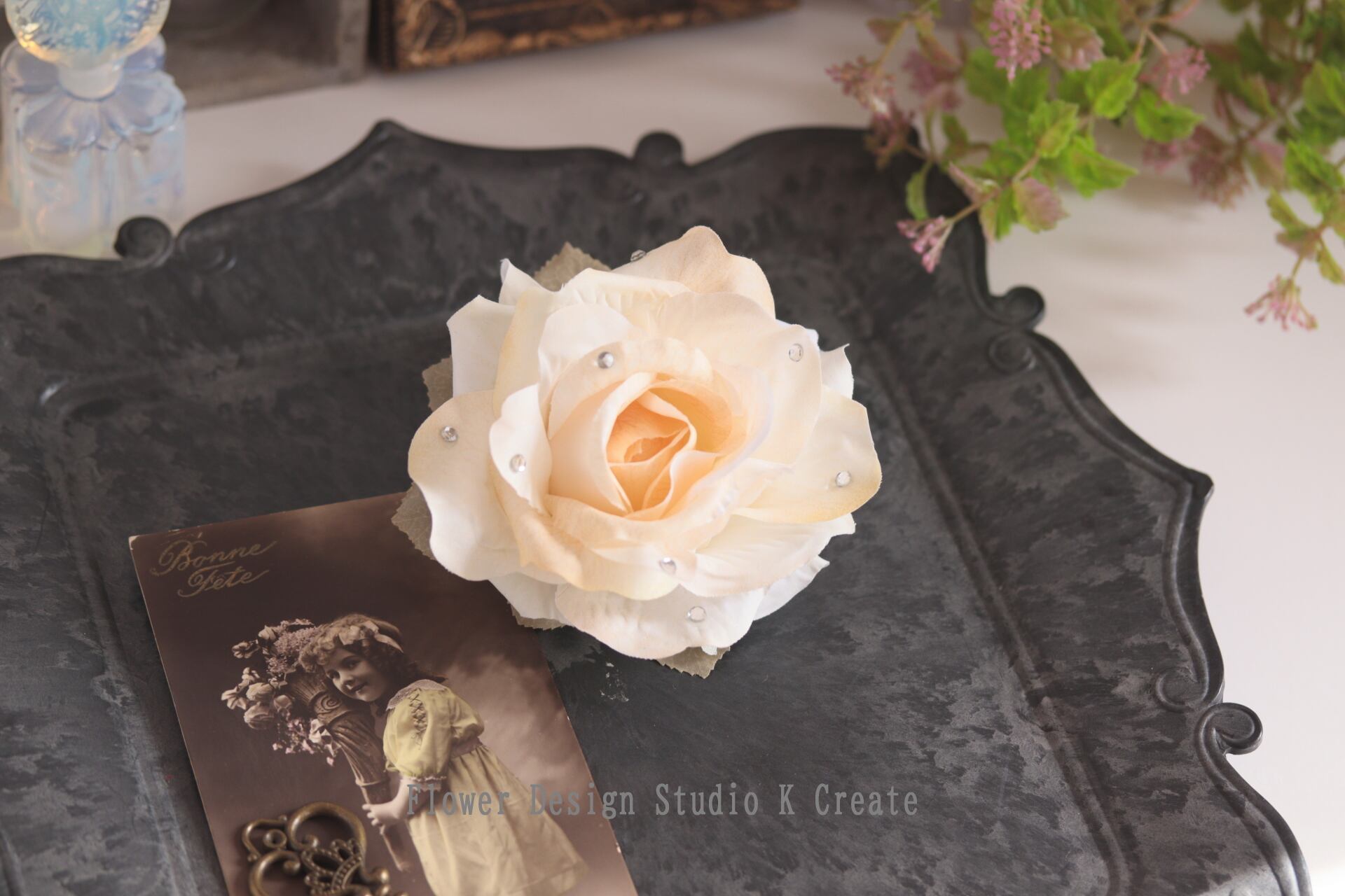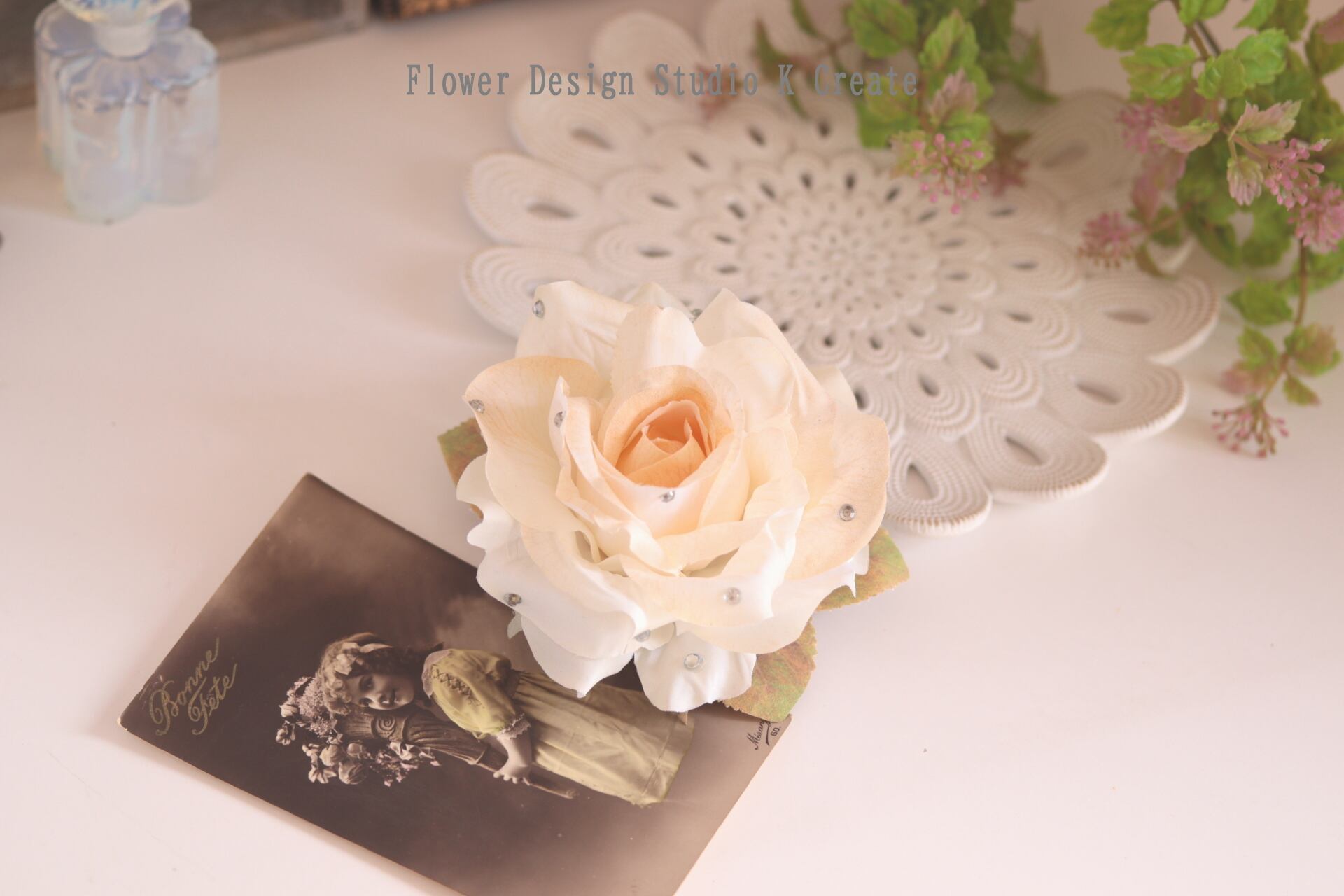 ライトストーンのついたエクリュローズのヘアクリップ フラメンコ バレエ 花径11~12cm エクリュ 薔薇 ヘアクリップ 髪飾り バラ 頭飾り 花飾り