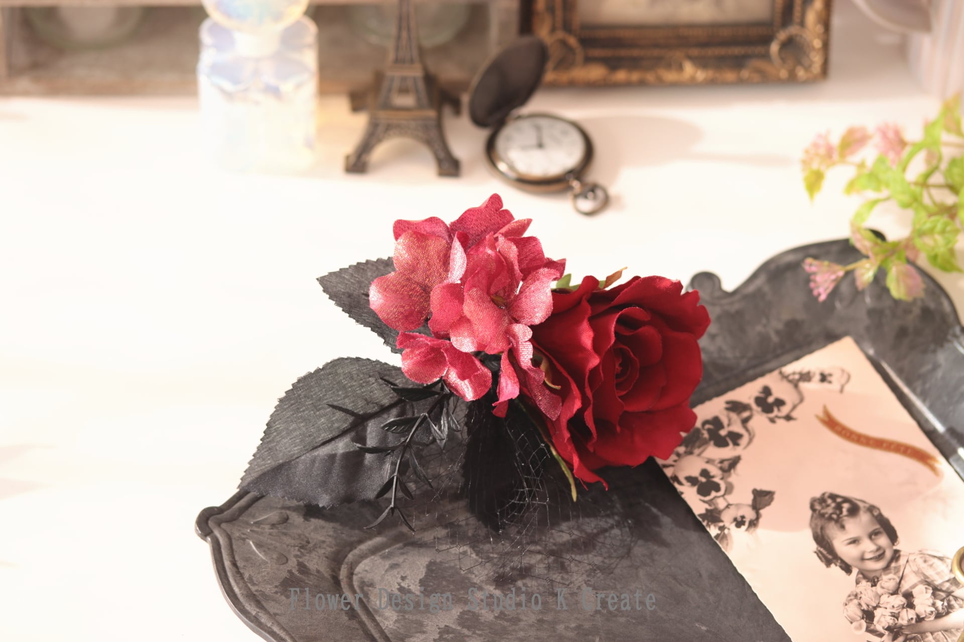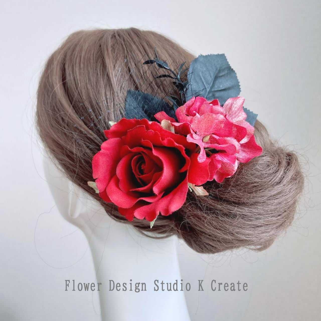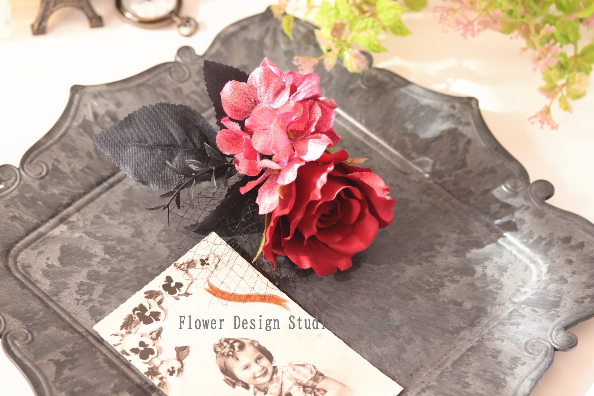 【訳有り】赤い薔薇とシャイニーピンクの紫陽花のアレンジUピン フラメンコ 赤 黒 フローレス フォーマル 髪飾り チュール