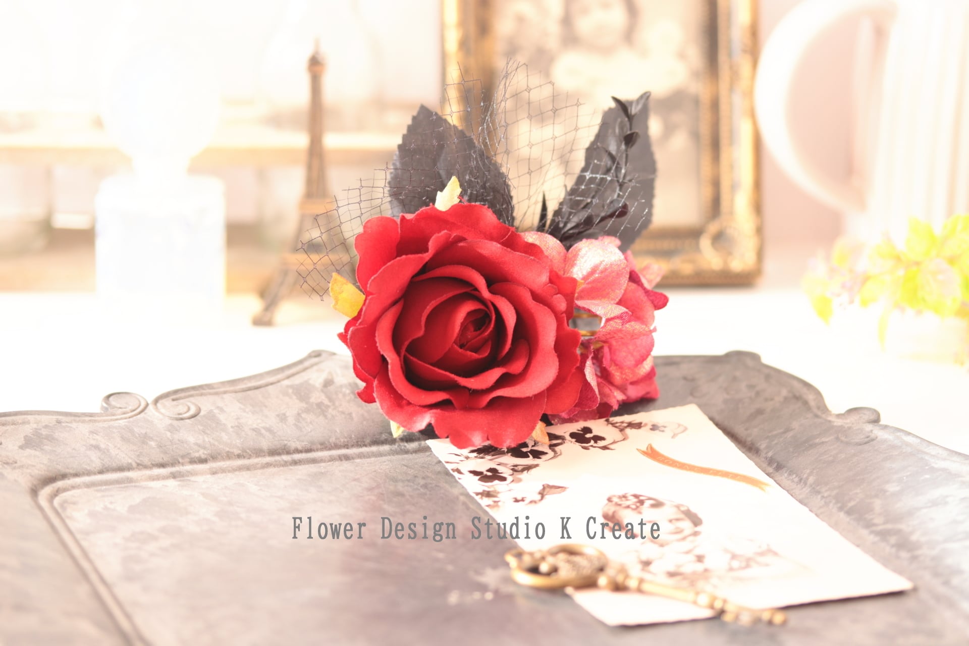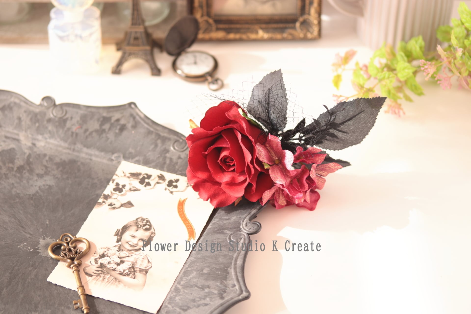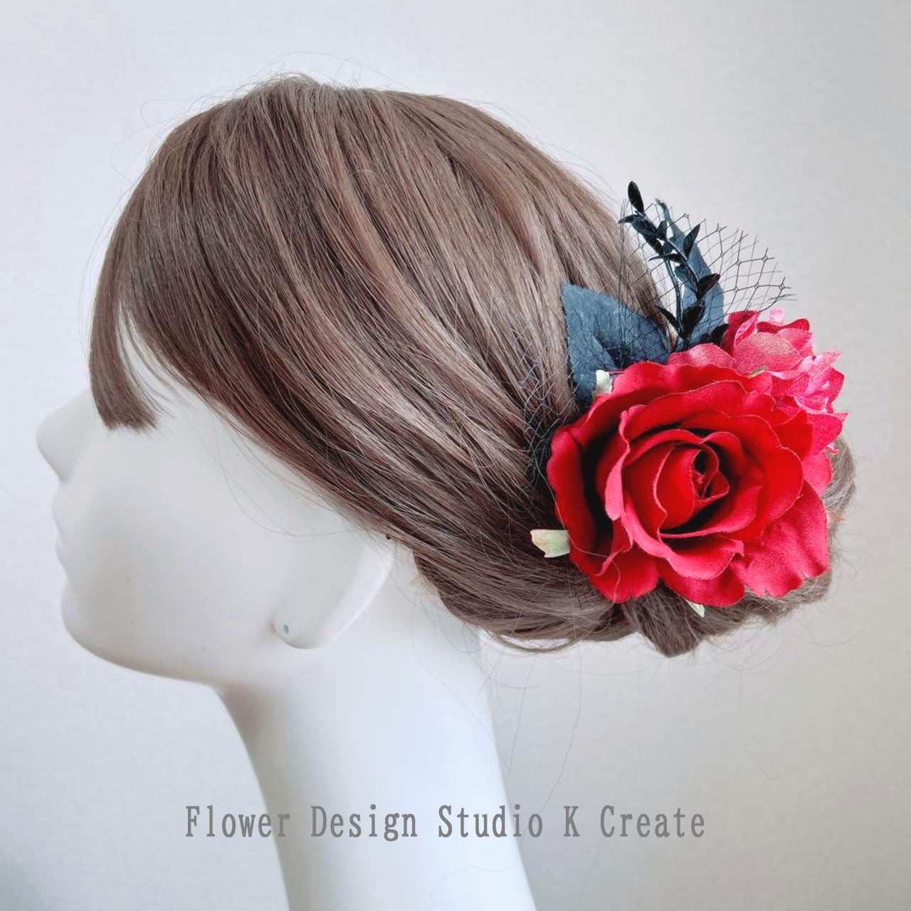 【訳有り】赤い薔薇とシャイニーピンクの紫陽花のアレンジUピン フラメンコ 赤 黒 フローレス フォーマル 髪飾り チュール
