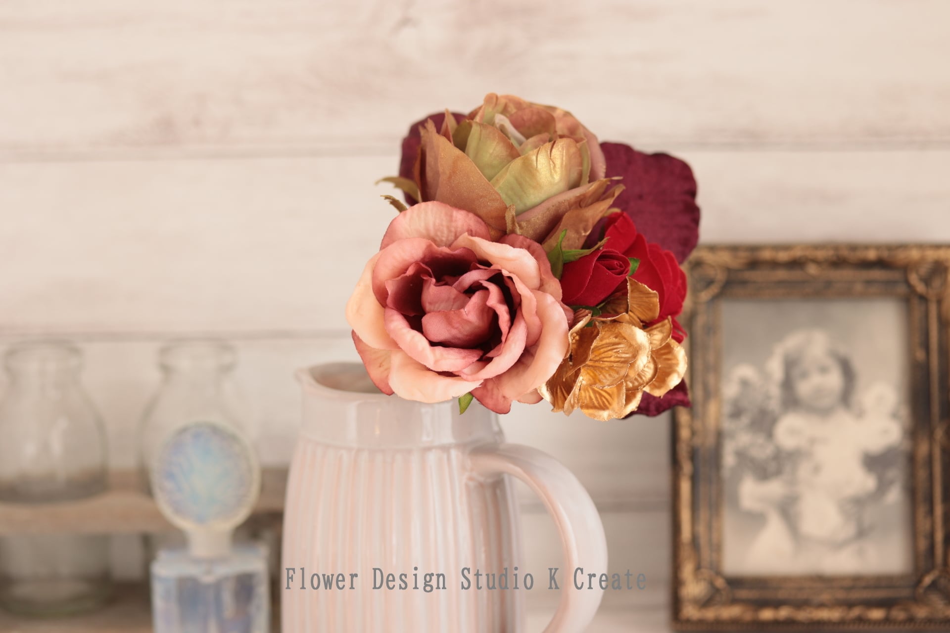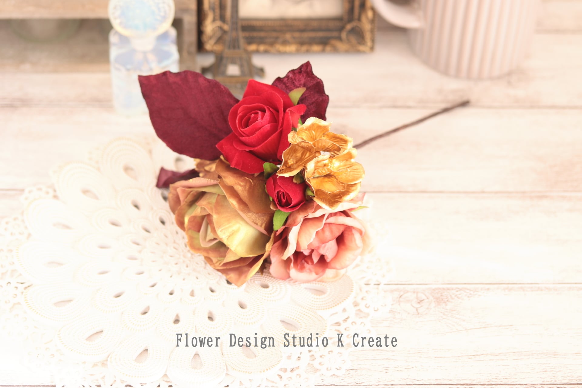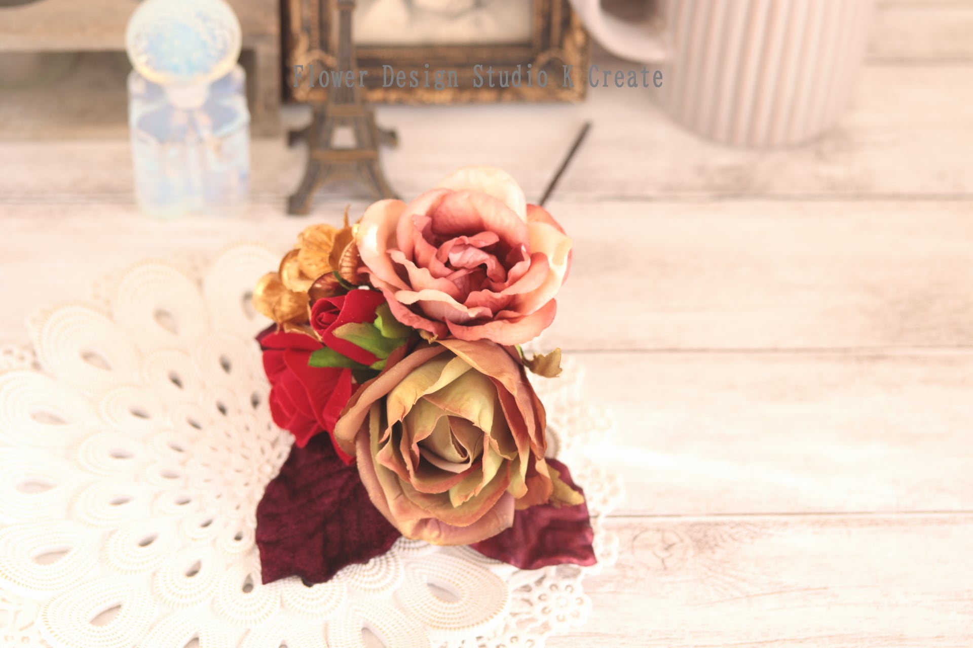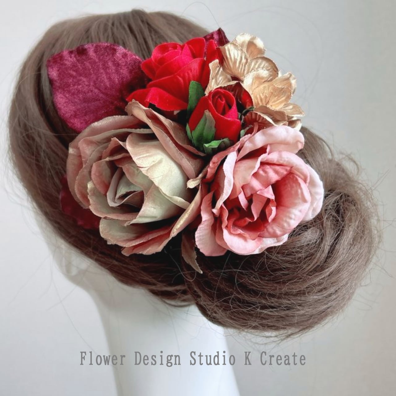 ピンクゴールドの薔薇と赤とモーブの薔薇の髪飾 フラメンコ ゴールド ボルドー フローレス バラ 赤いバラ アジサイ バラ 髪飾り ダンス フォーマル パーティー