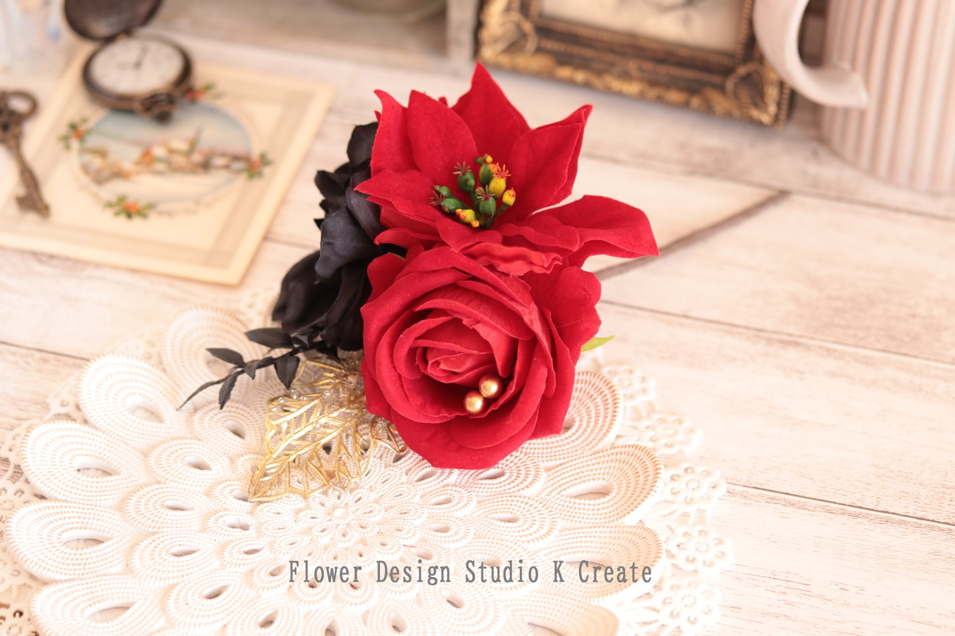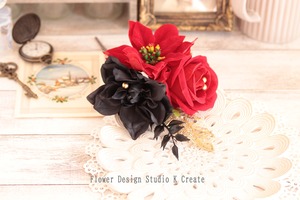 赤い薔薇とポインセチアの髪飾り 赤と黒 髪飾り フラメンコ 赤 黒 ゴールド ビジュー 発表会 結婚式 フローレス 花飾り