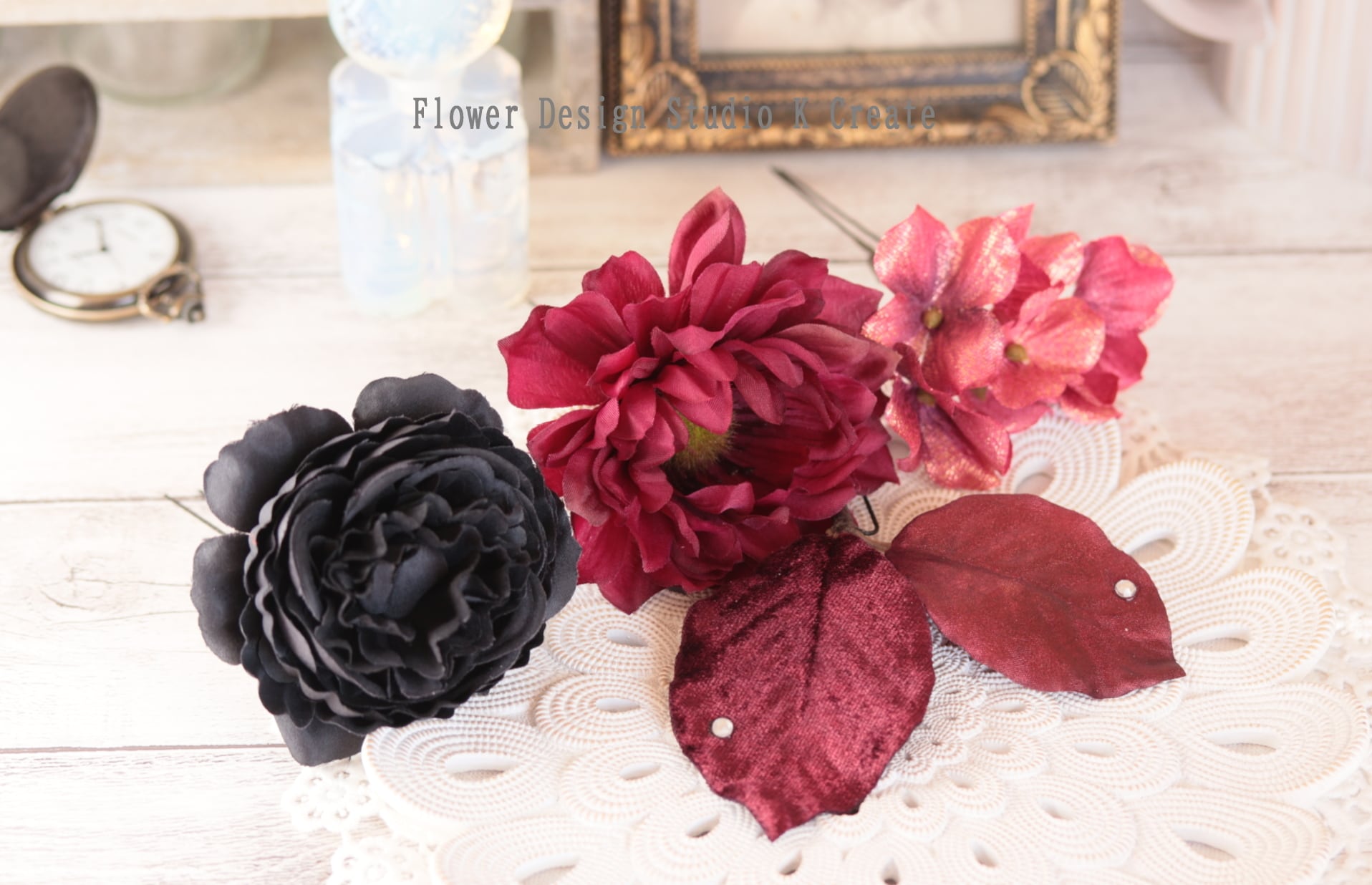 黒いラナンキュラスとボルドーのダリアの髪飾り Uピン ラナンキュラス ダリア 紫陽花 ボルドー シック ダンス フラメンコ フォーマル ウェディング パーティー 髪飾り ヘッドドレス