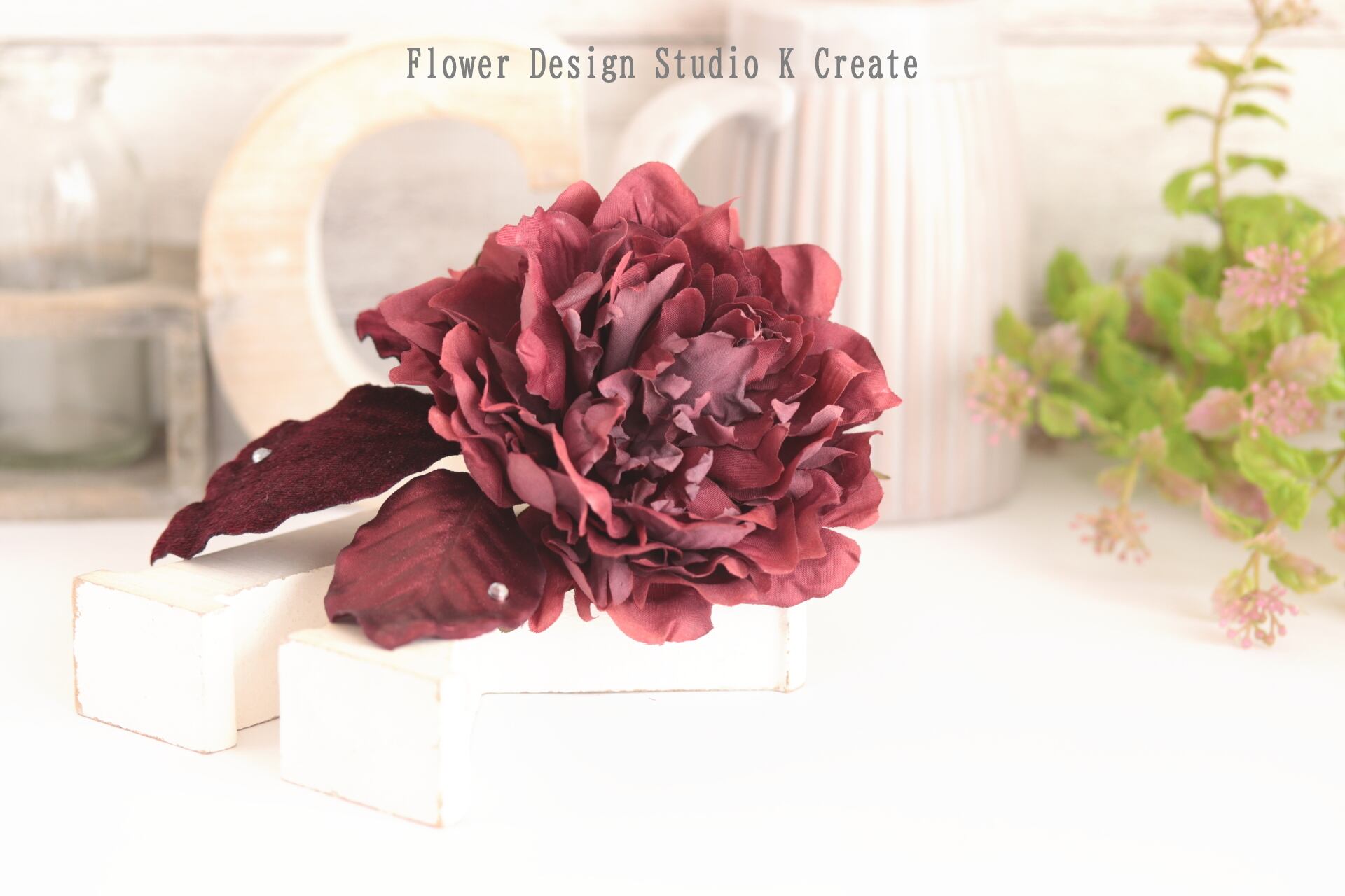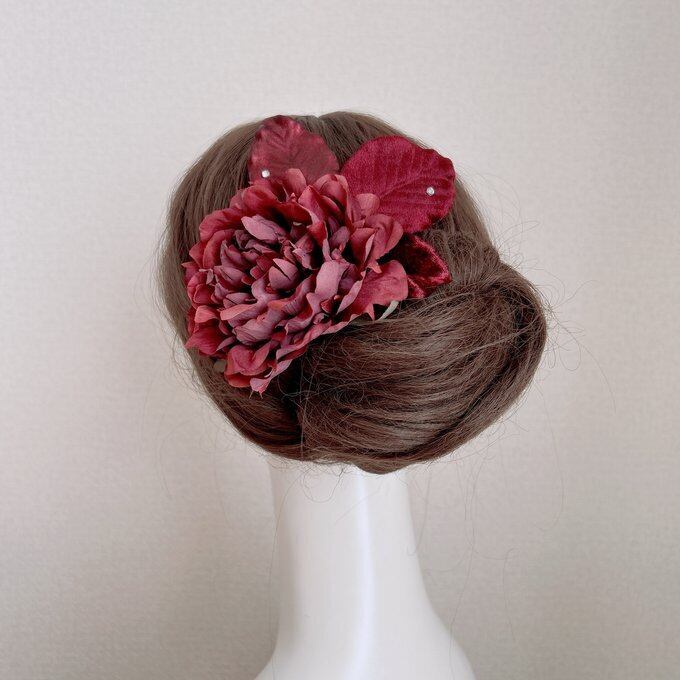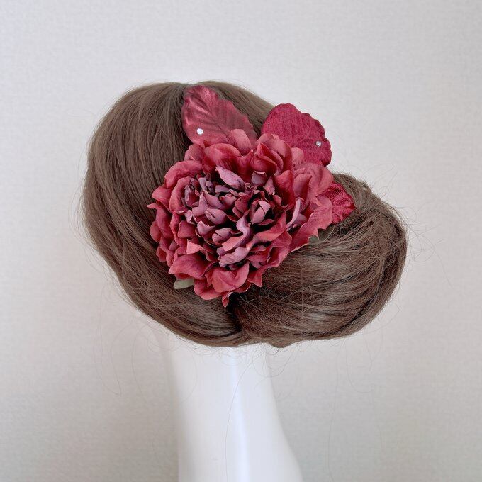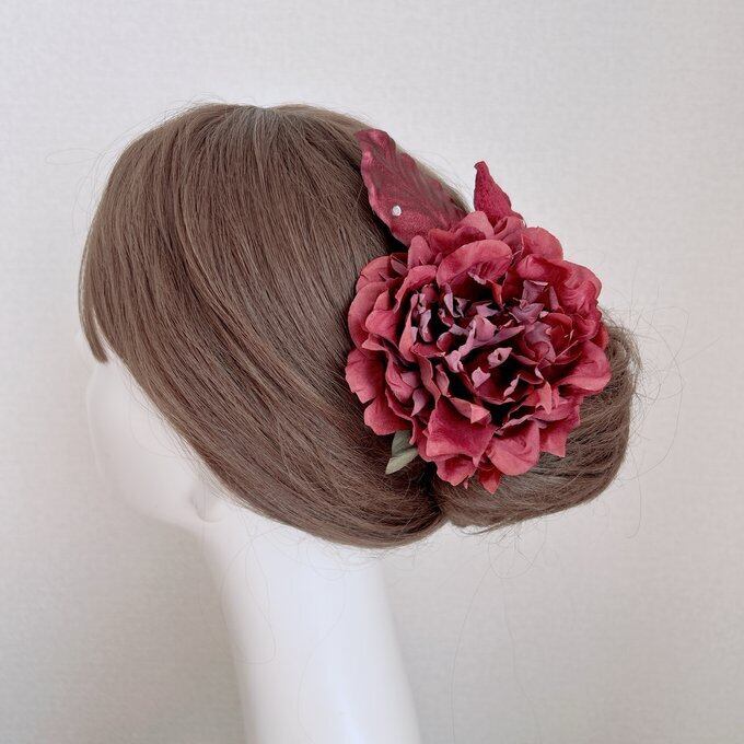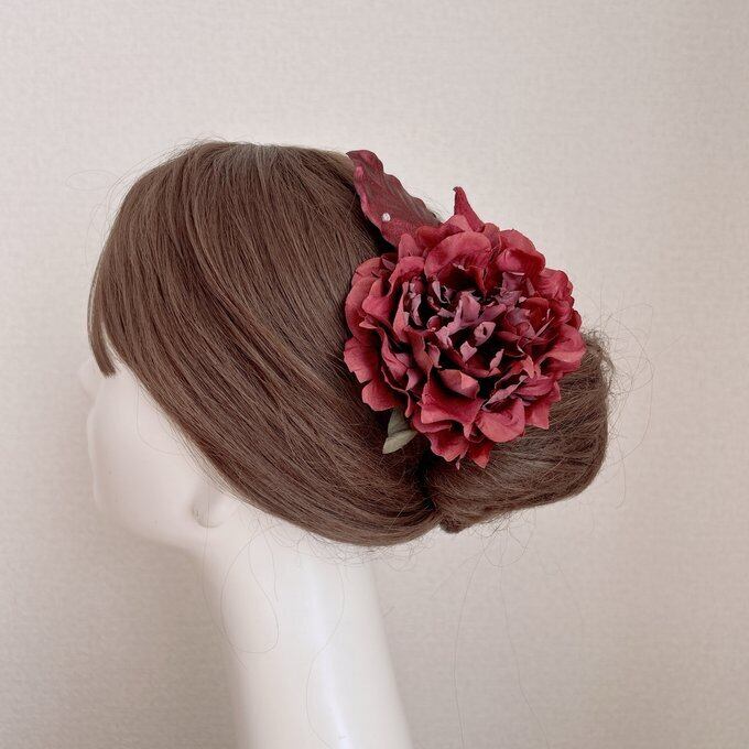 ボルドーのピオニーとベロアの葉っぱの髪飾り フラメンコ ダンス 着物 フローレス 芍薬 ピオニー ヘッドピース 髪飾り