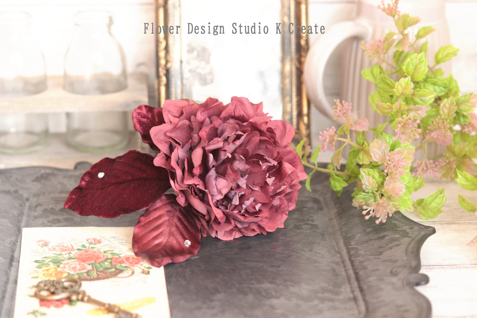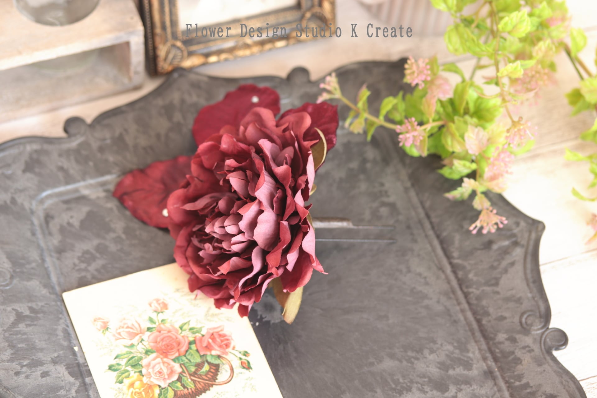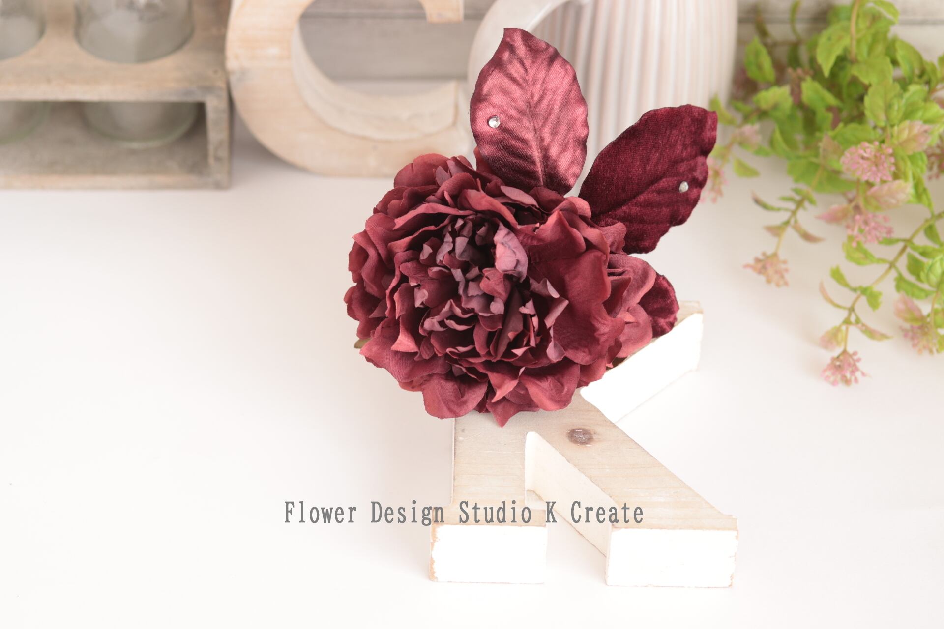 ボルドーのピオニーとベロアの葉っぱの髪飾り フラメンコ ダンス 着物 フローレス 芍薬 ピオニー ヘッドピース 髪飾り