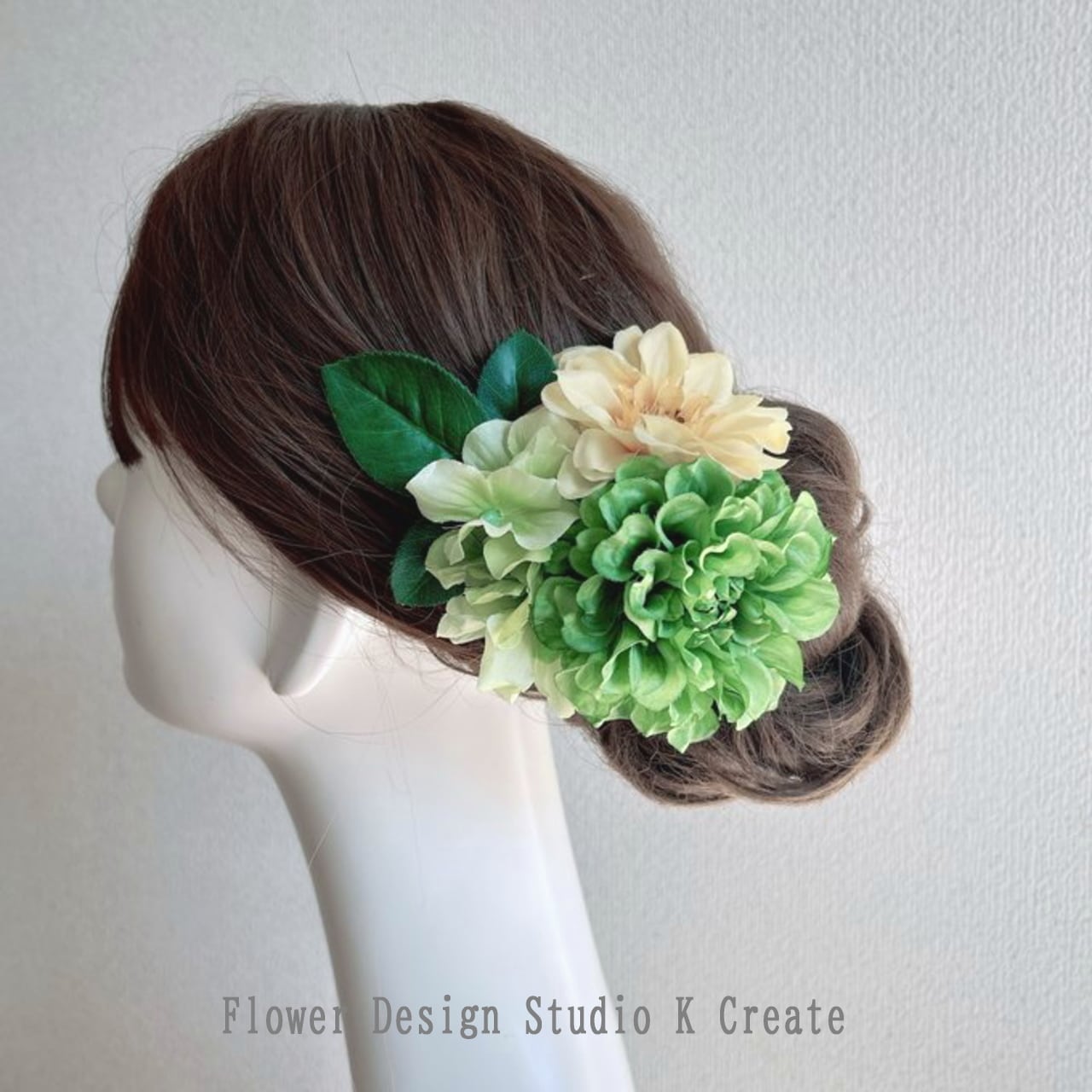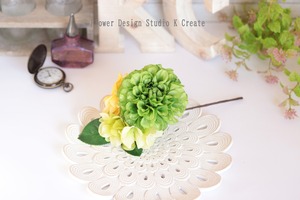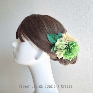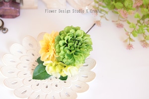 緑色と黄色のダリアと紫陽花の髪飾り フラメンコ フローレス バラ アジサイ 黄色 黄緑 花 髪飾り ダンス フォーマル パーティー