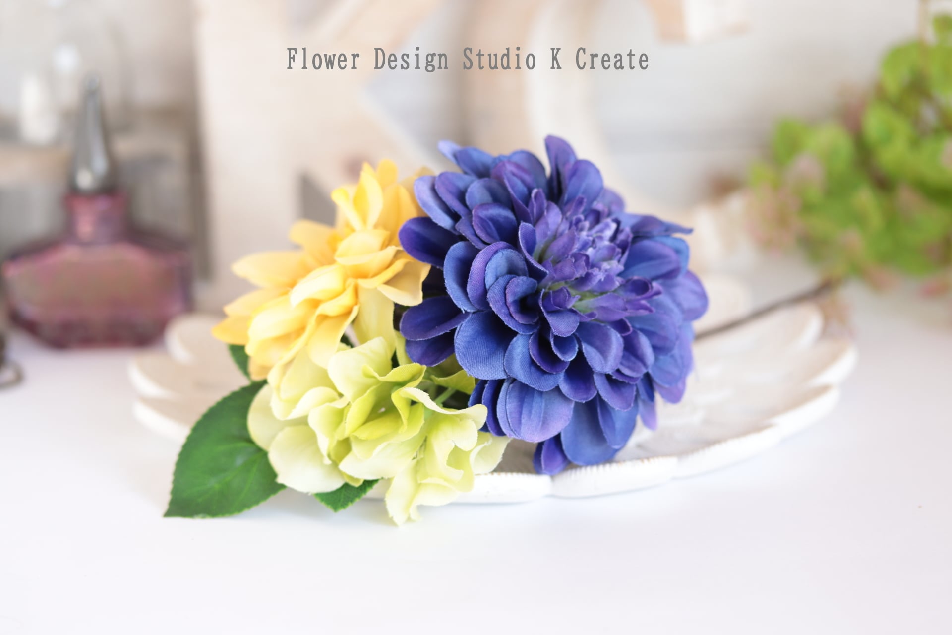 #イエロー #ダリア #黄緑 #紫陽花 #ブルー