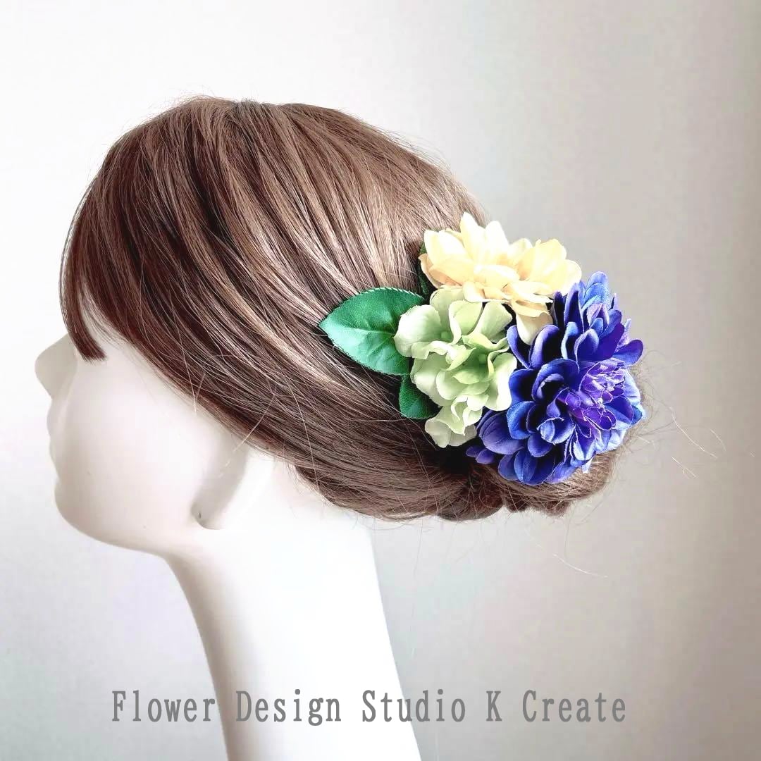青と黄色のダリアと紫陽花の髪飾り フラメンコ イエロー 青い花 黄緑 ブルー 髪飾り 花 フローレス ダンス フラメンコの髪飾り