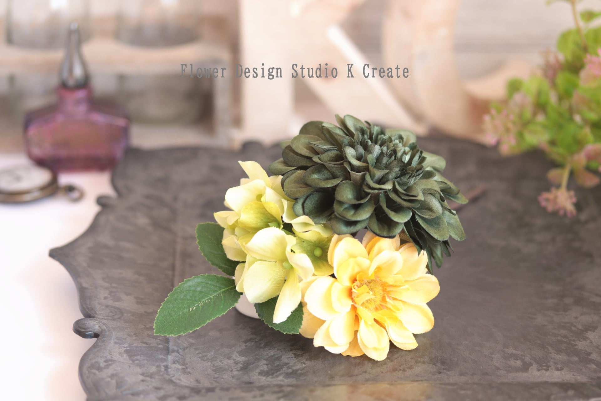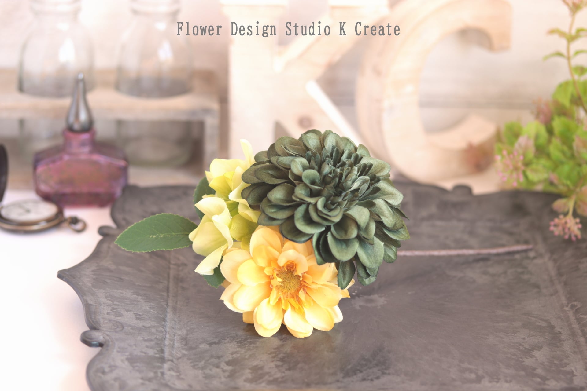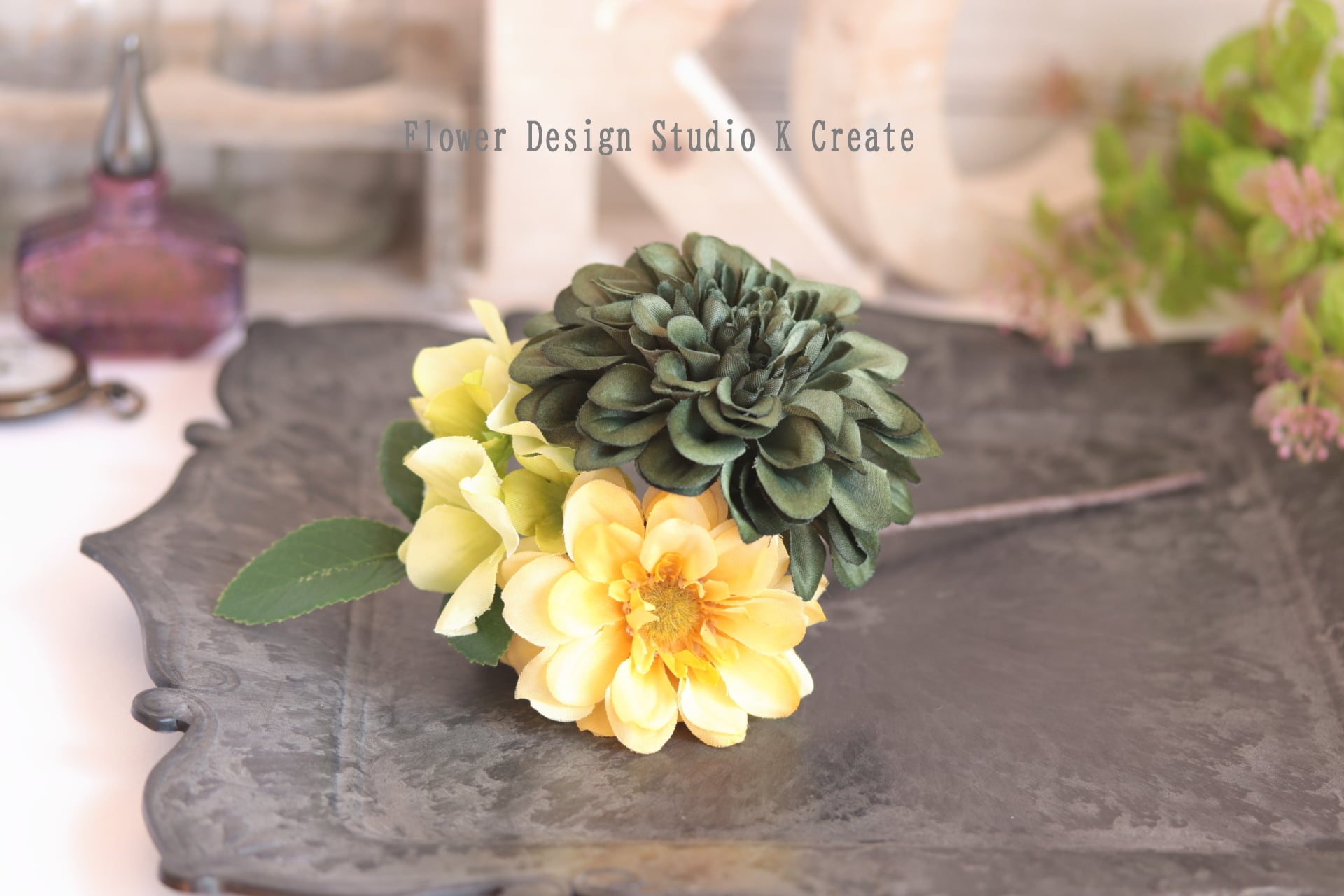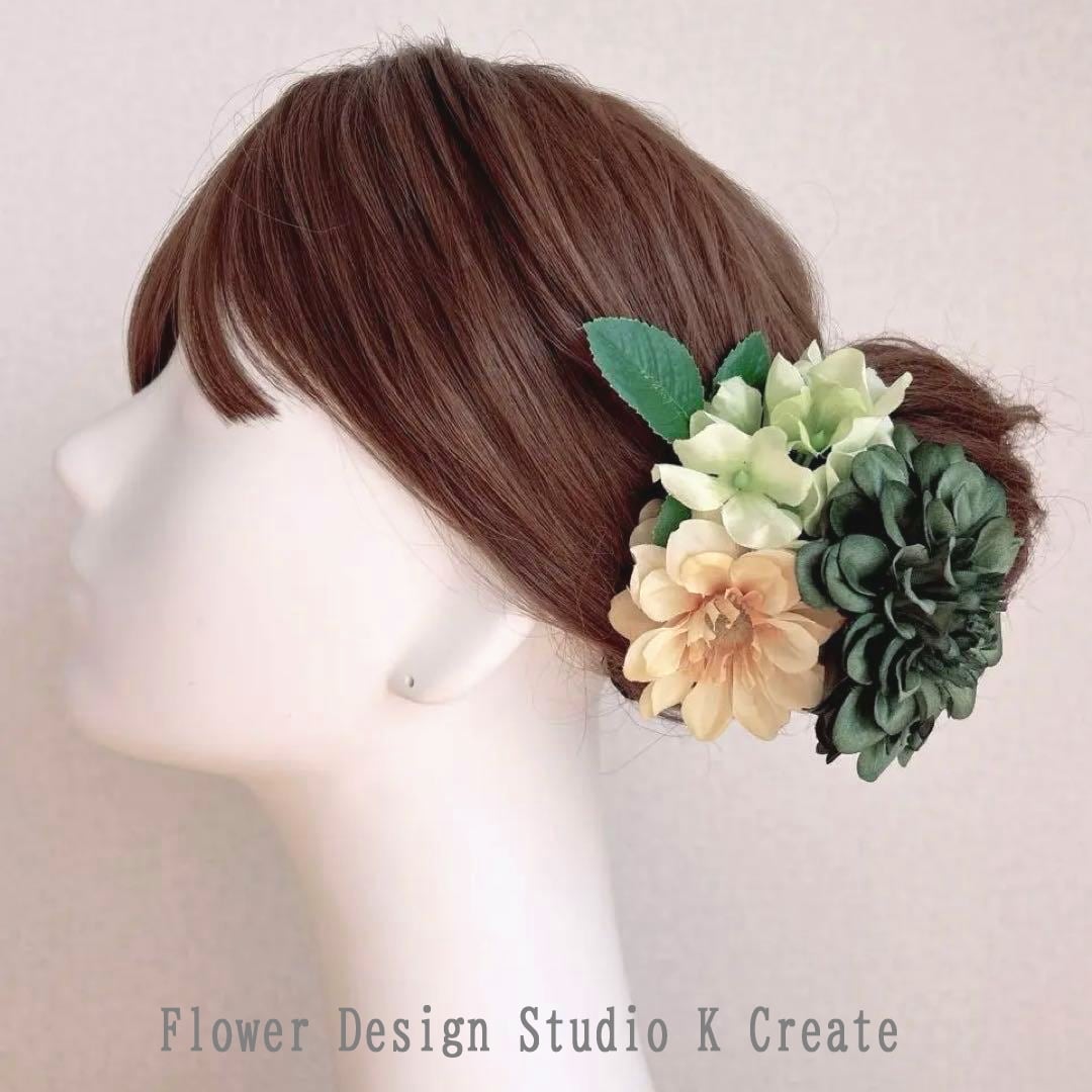 モスグリンと黄色のダリアと紫陽花の髪飾り フラメンコ アジサイ 黄色 深緑 黄緑 フローレス ダンス グリン ダリア ヘアアクセサリー