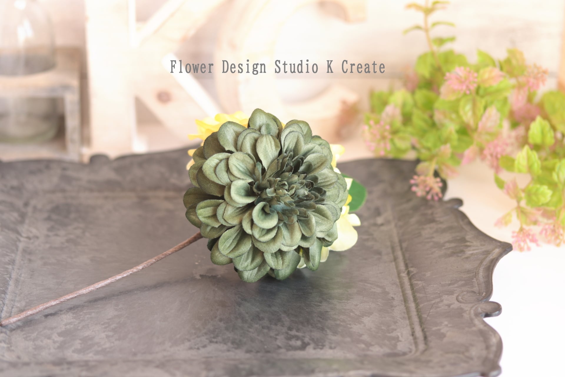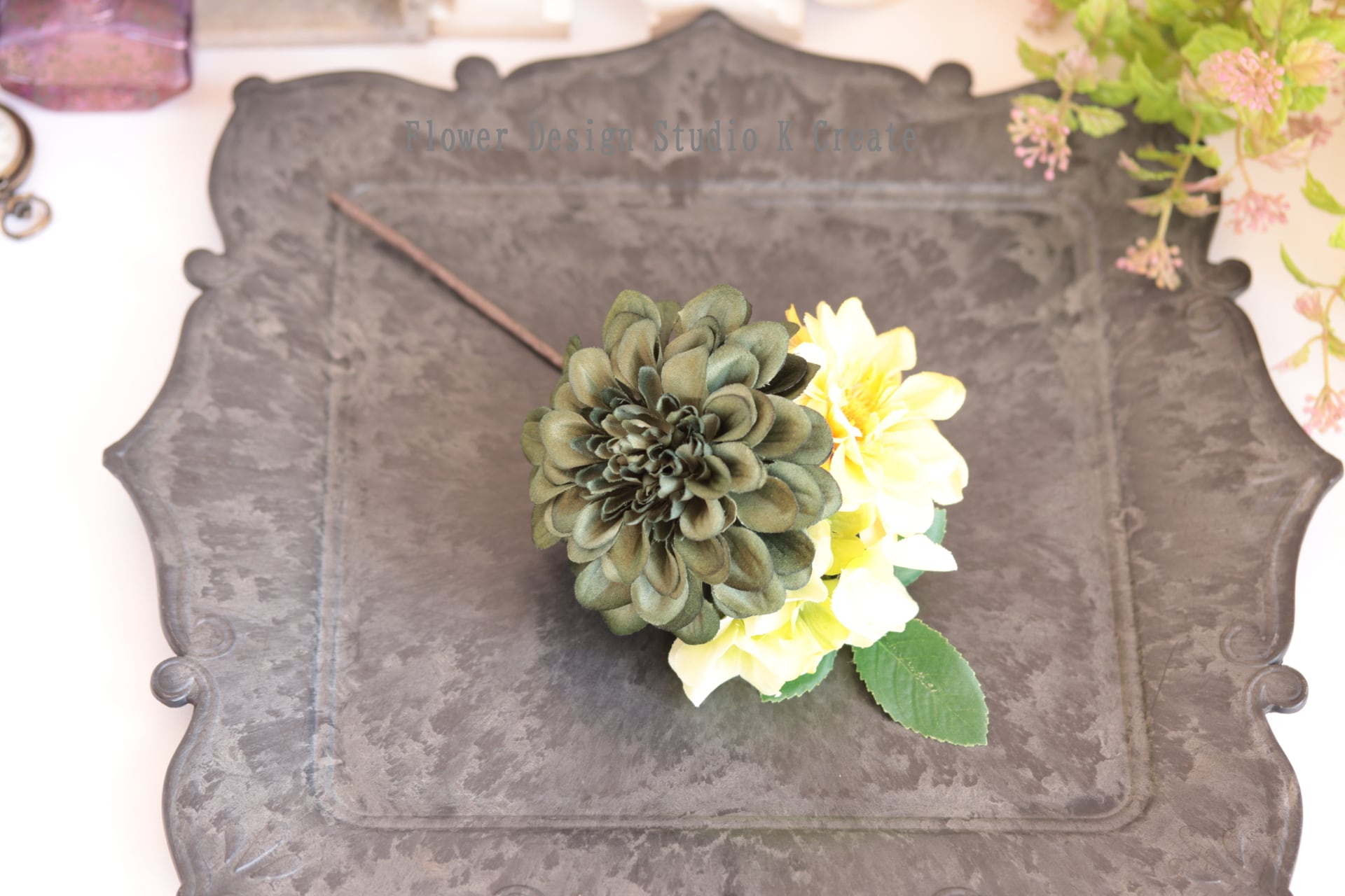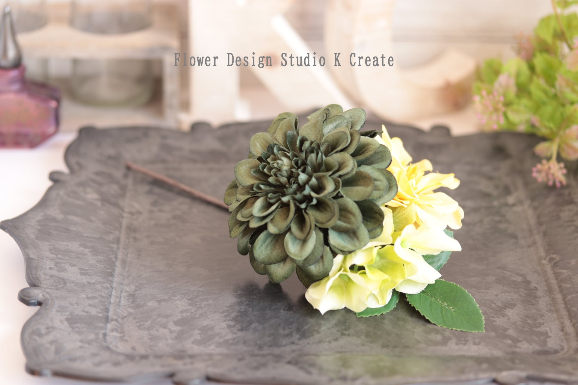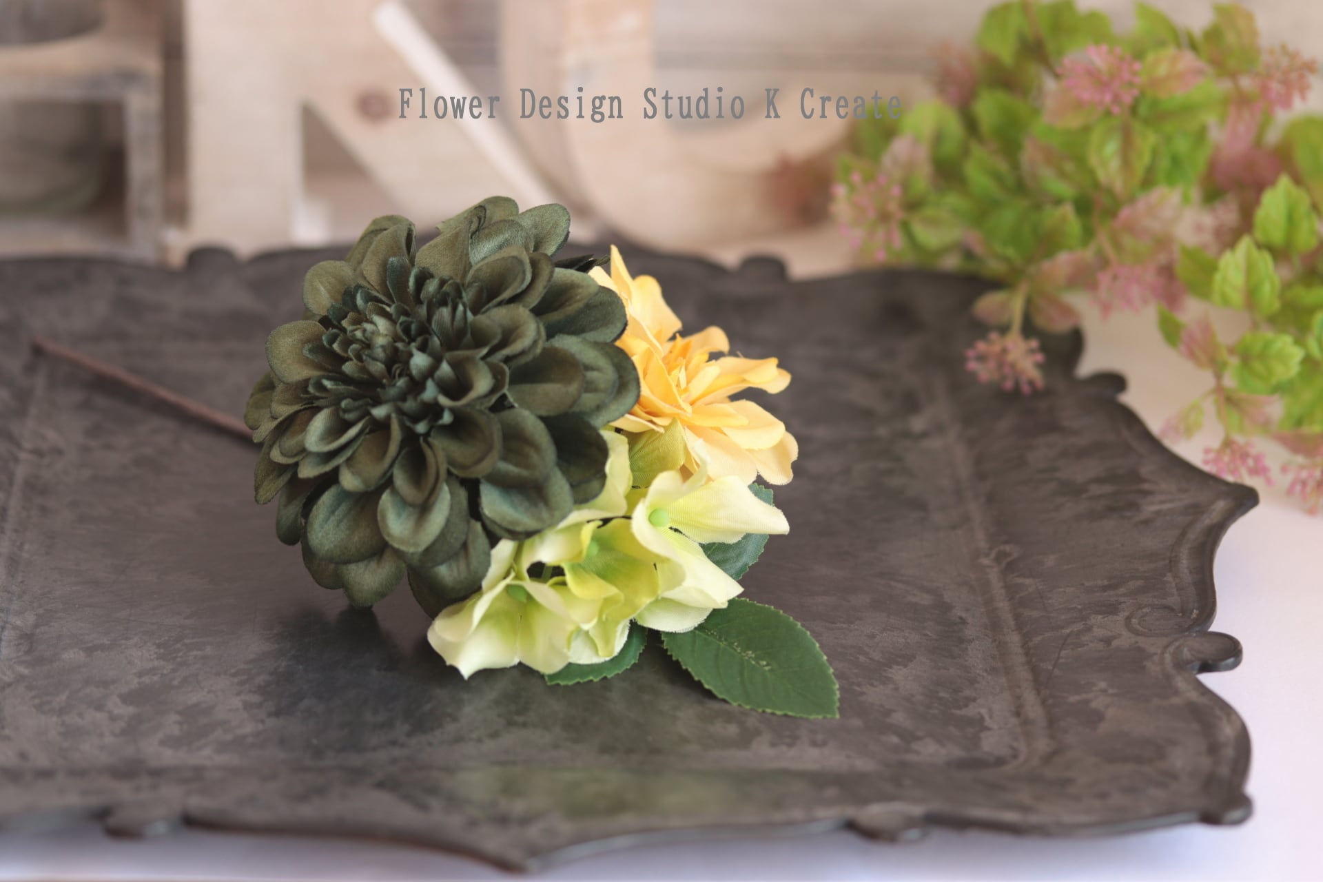 モスグリンと黄色のダリアと紫陽花の髪飾り フラメンコ アジサイ 黄色 深緑 黄緑 フローレス ダンス グリン ダリア ヘアアクセサリー