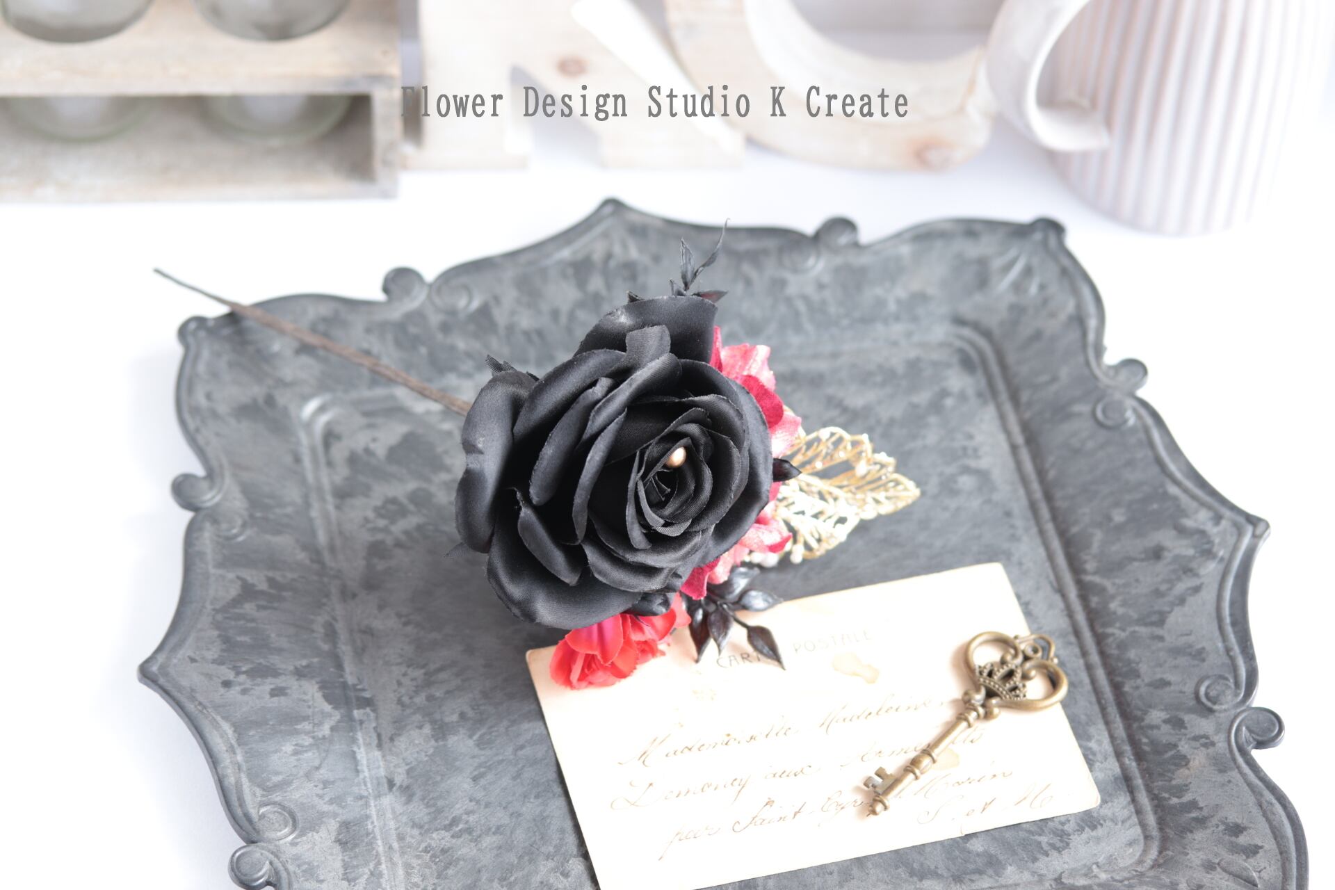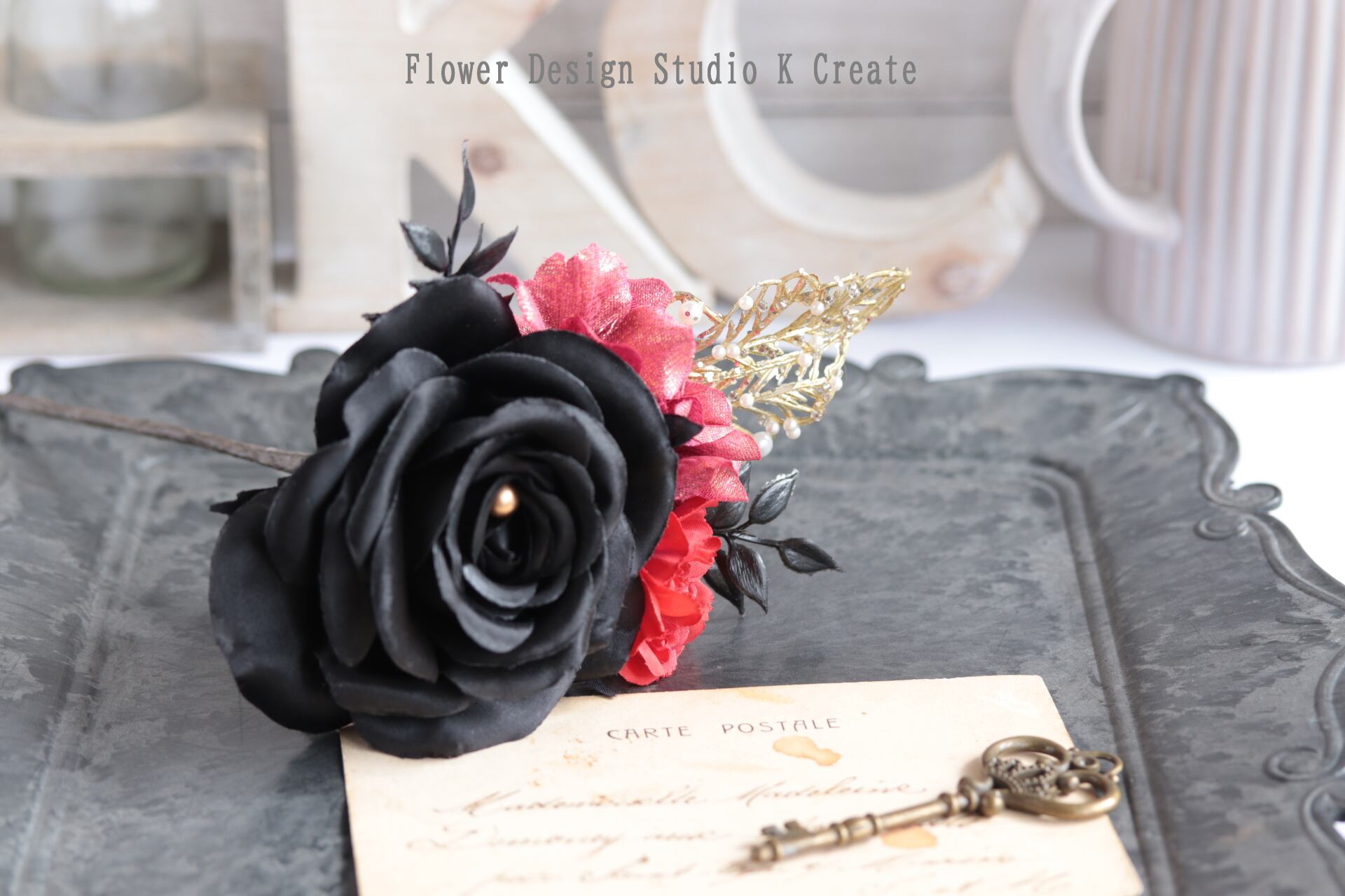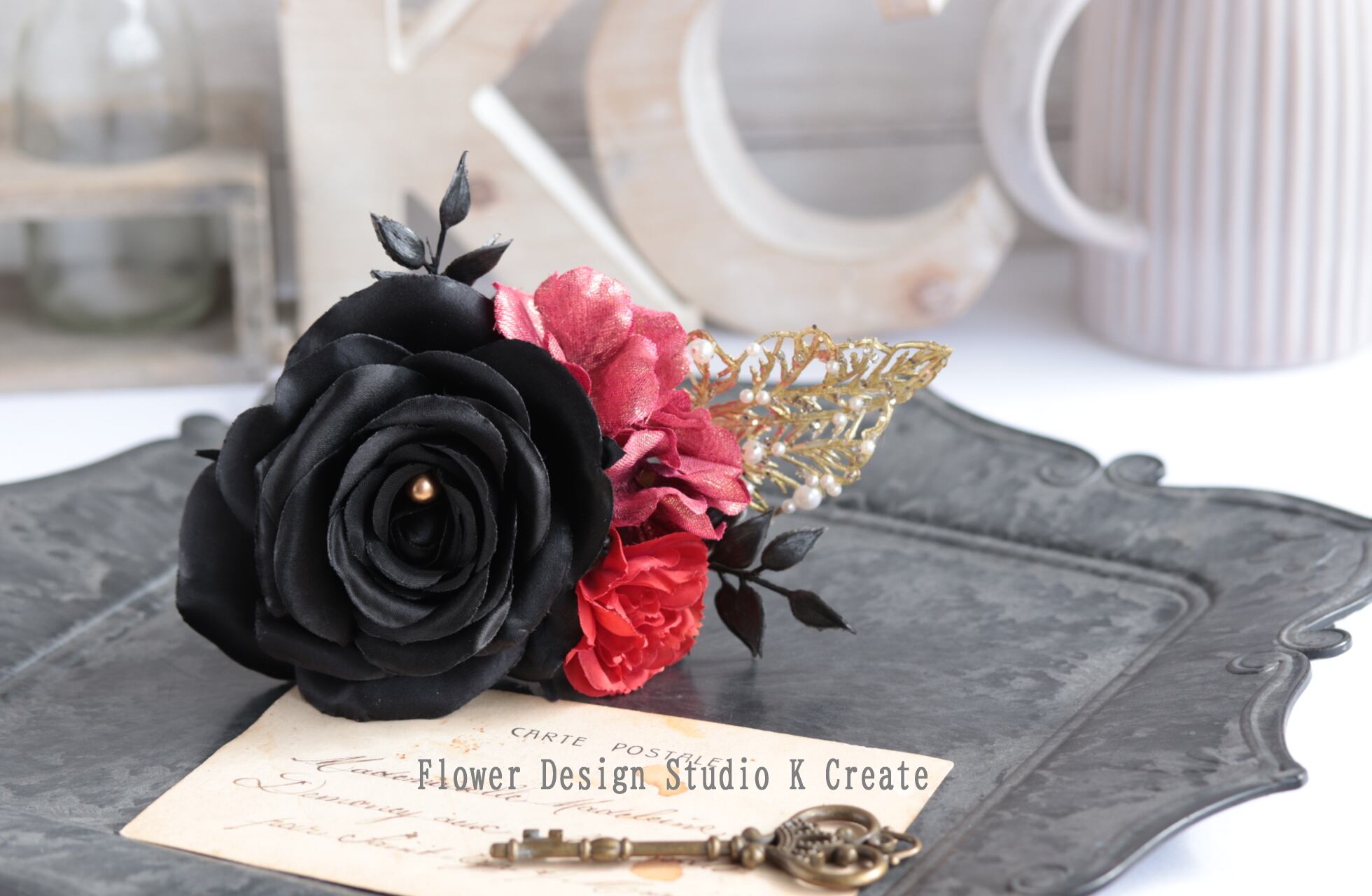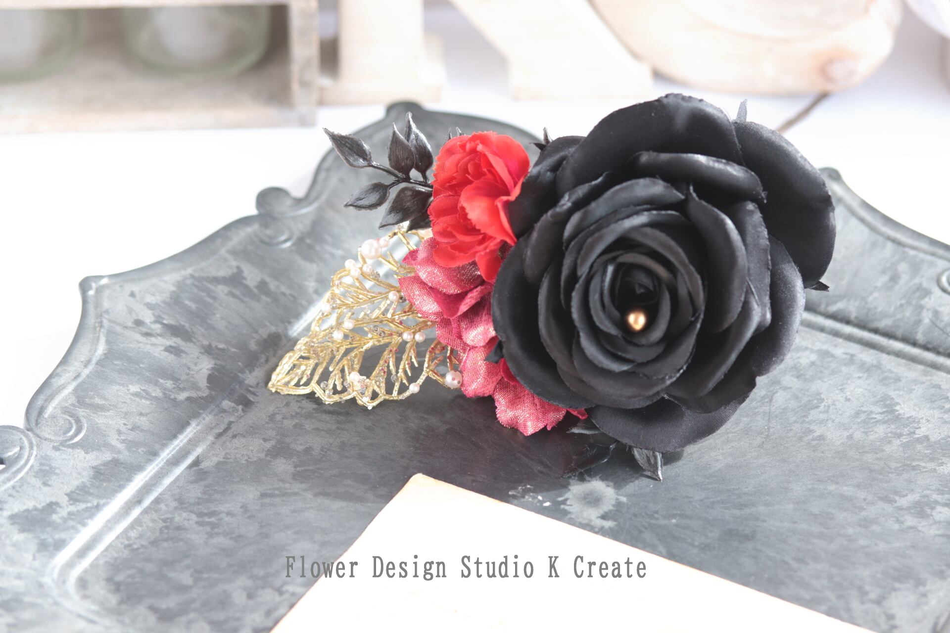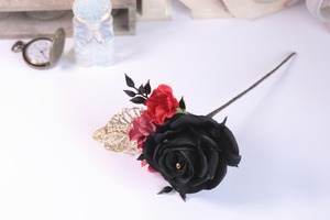 シックでモダンな黒い薔薇の髪飾りなので、