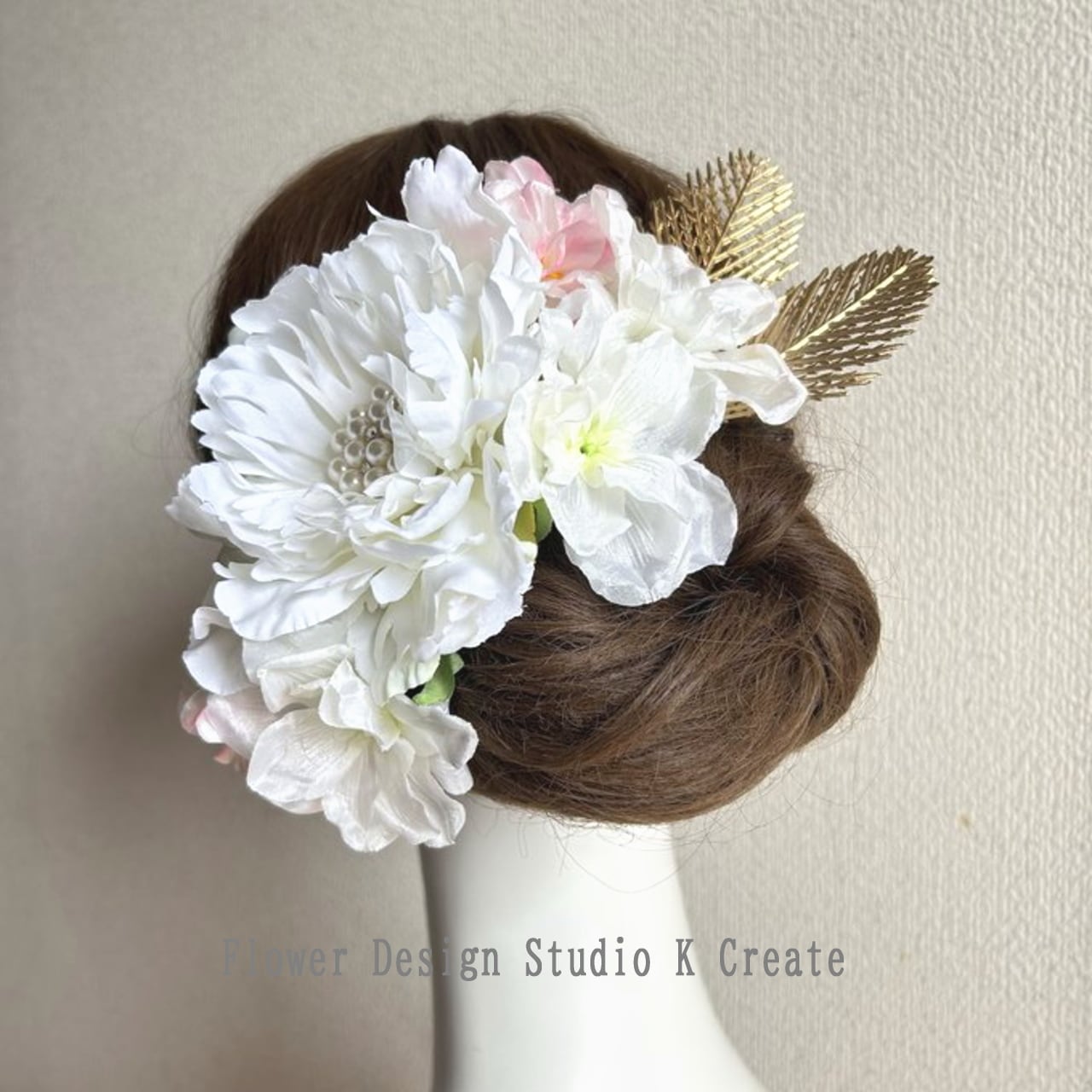 純白のビジューなピオニーとデルフィニュウムの和装髪飾り 和装婚 結婚式 神前式 色打掛 純白 白 桜 さくら 花嫁ヘア ピオニー