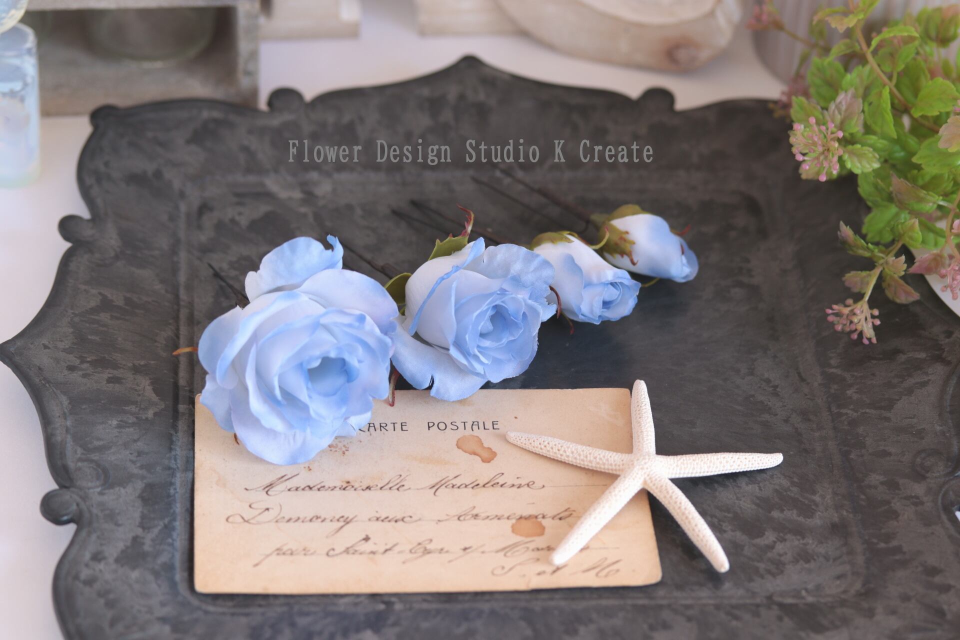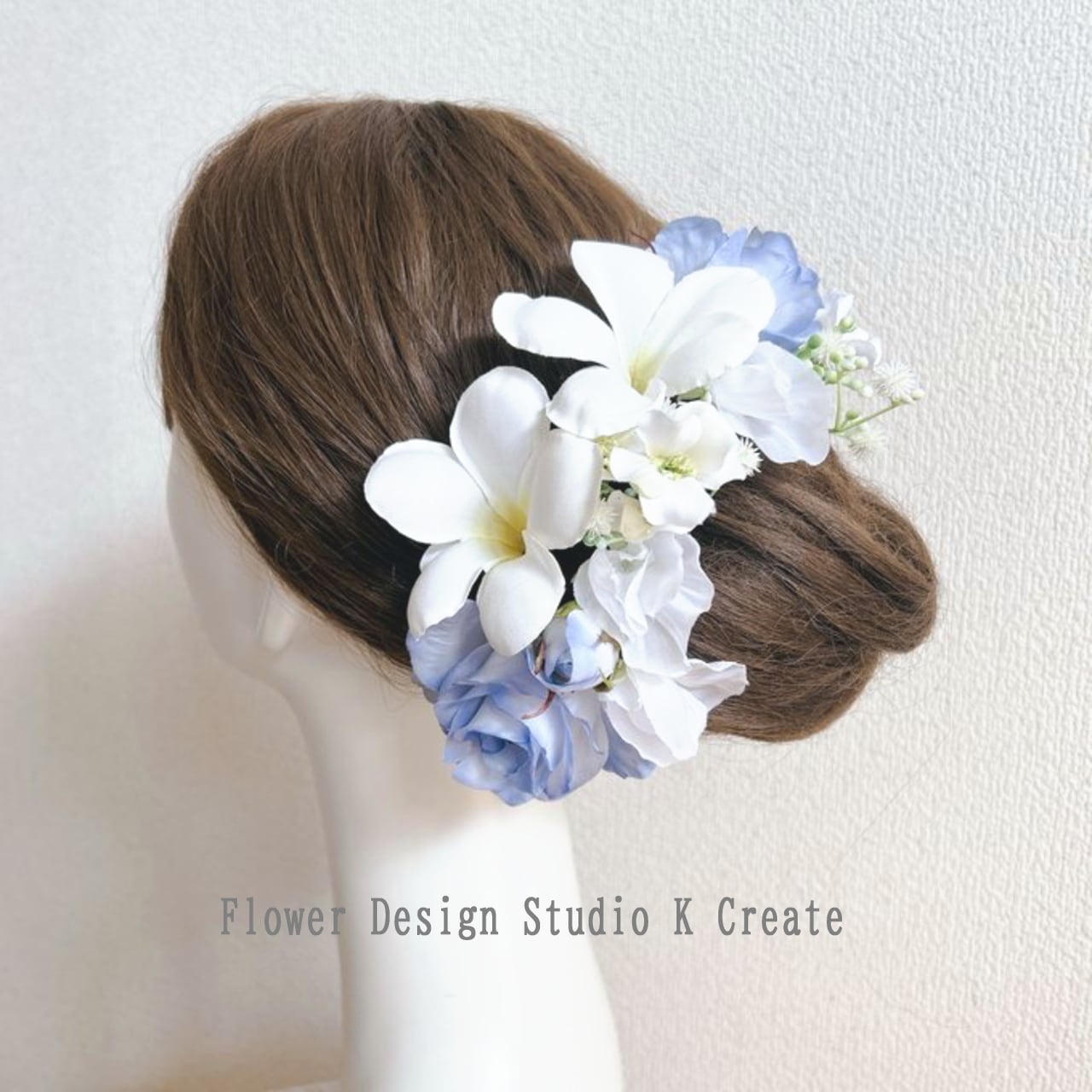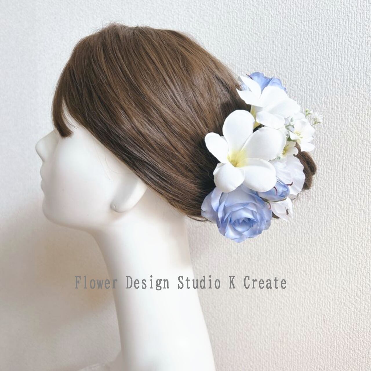 水色の薔薇とプルメリアのヘッドドレス 紫陽花 スィートピー 青い薔薇 プルメリア