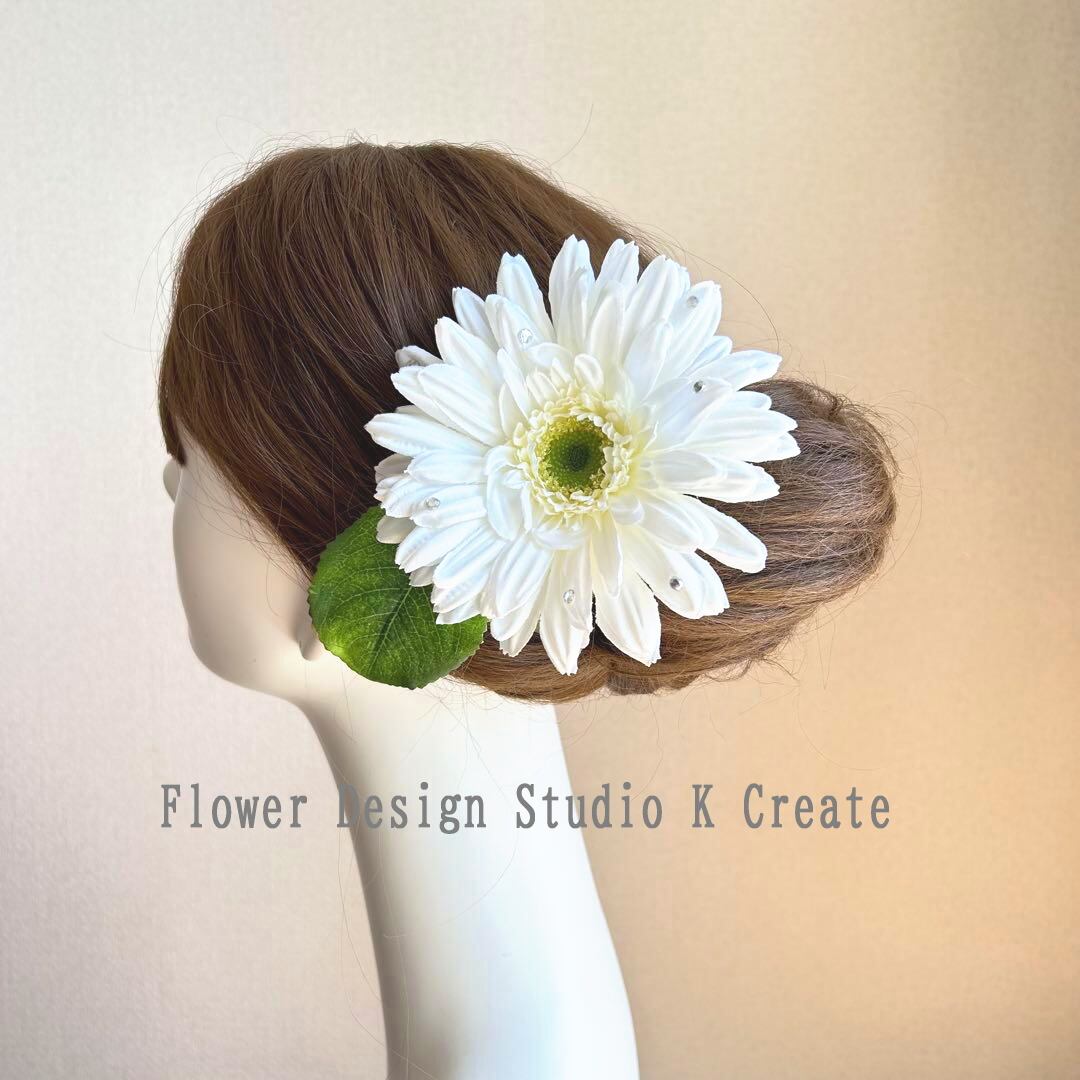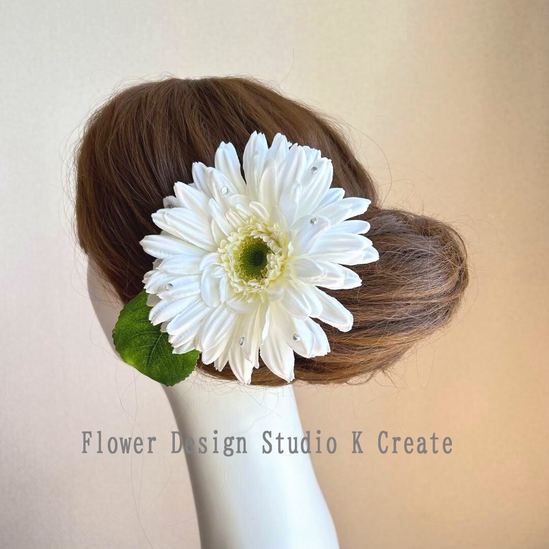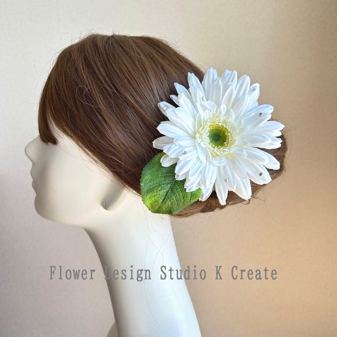 大輪の純白のガーベラと葉っぱの髪飾り Uピン フラメンコ ダンス ガーベラ 白 結婚式 成人式 入学式 卒業式 袴 着物