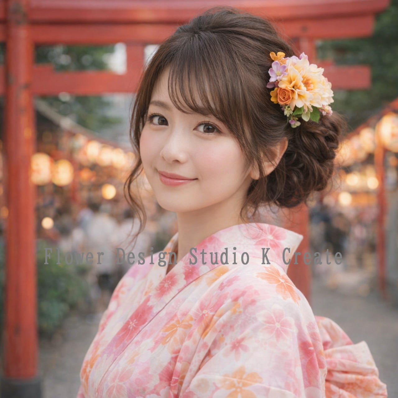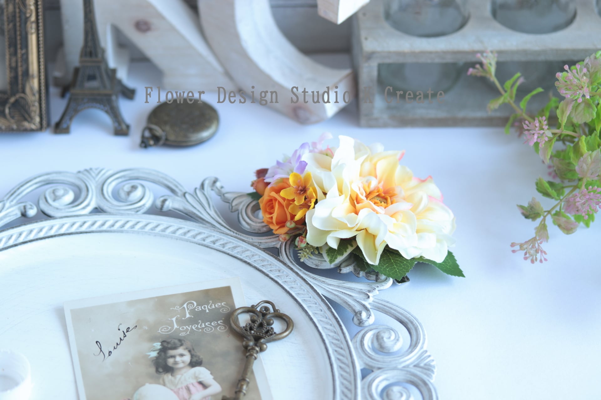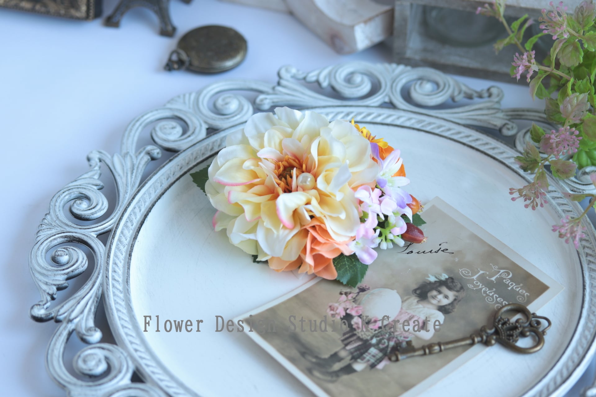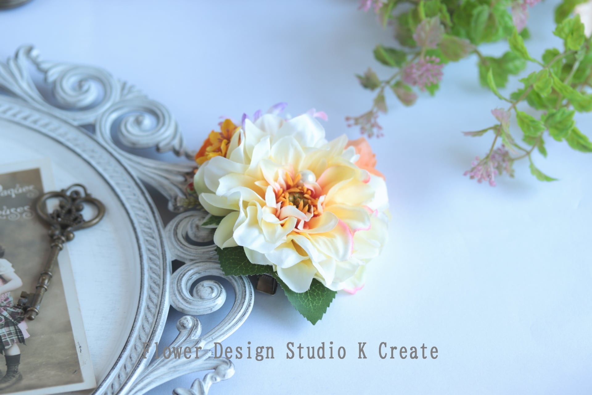 クリームイエローのダリアと紫陽花のヘアクリップ クリーム 黄色 浴衣 成人式 着物髪飾り 和装髪飾り お花 髪飾り イエロー