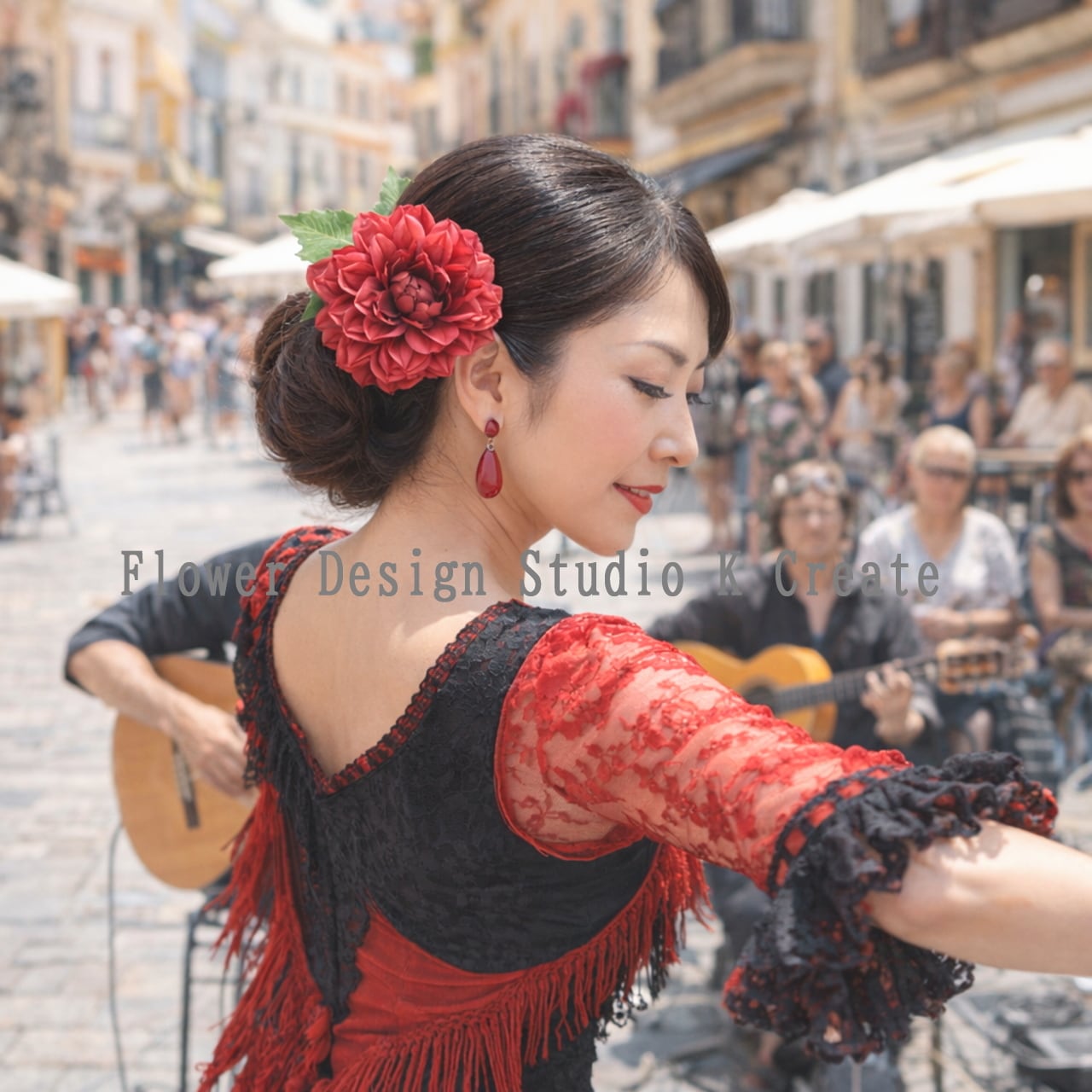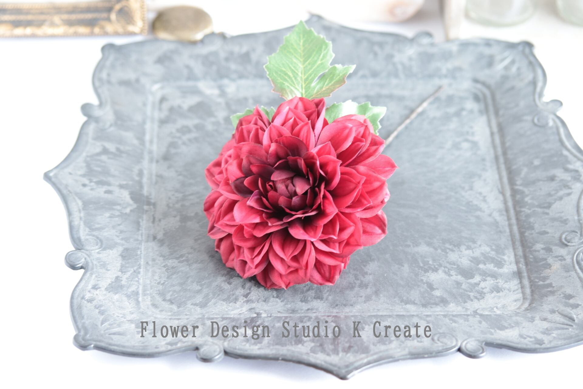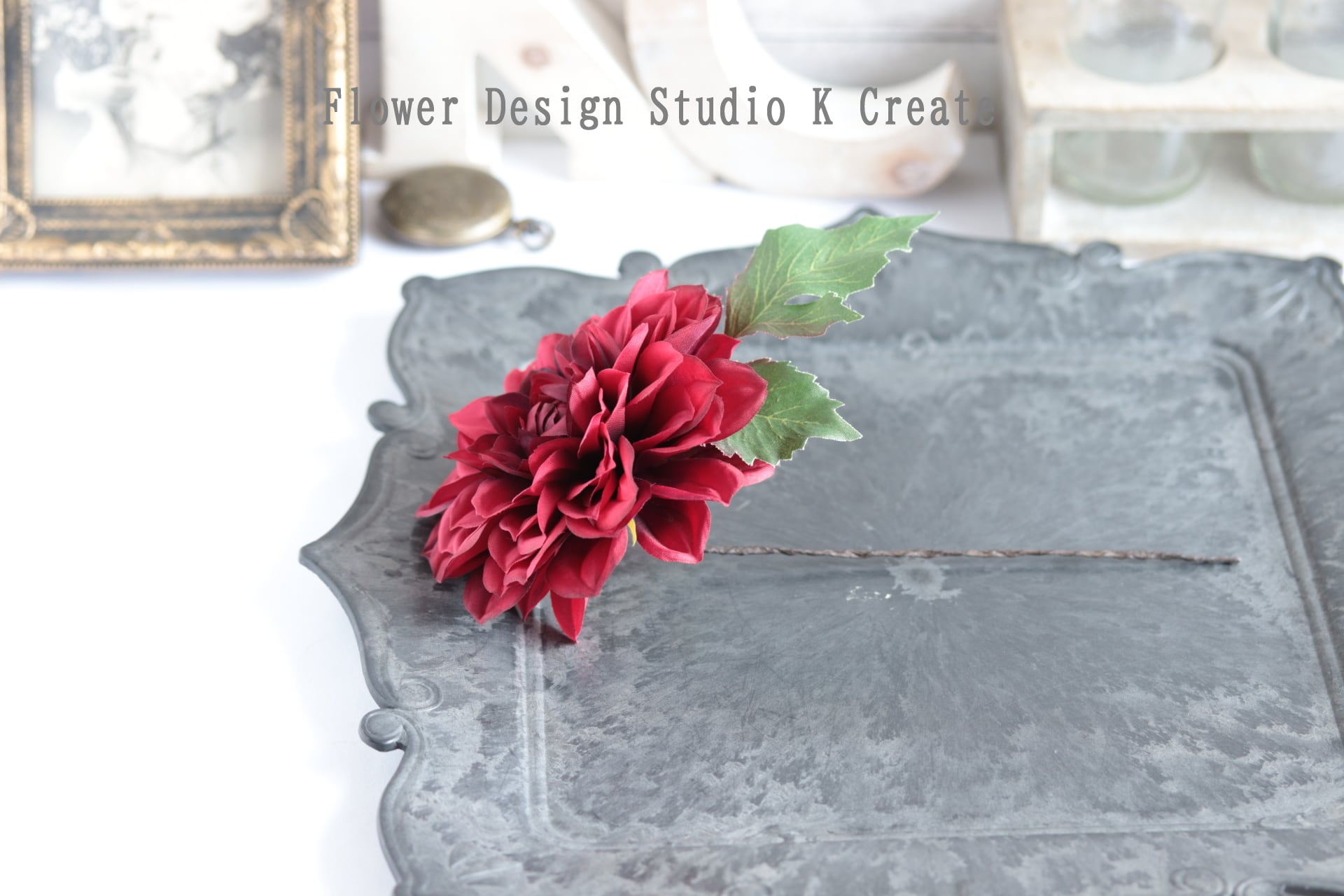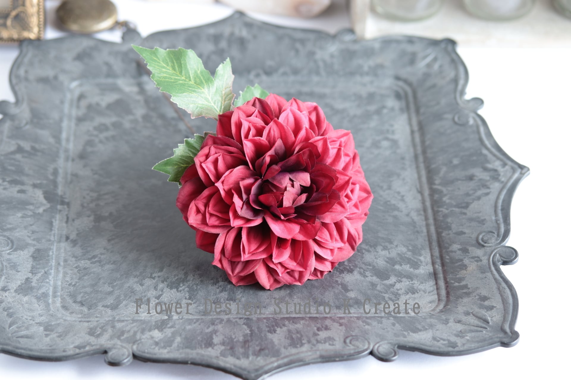 バーガンディのダリアと葉っぱの髪飾り(シングルワイヤー) 花径12cm ダンス 赤 ダリア フラメンコ フローレス 花