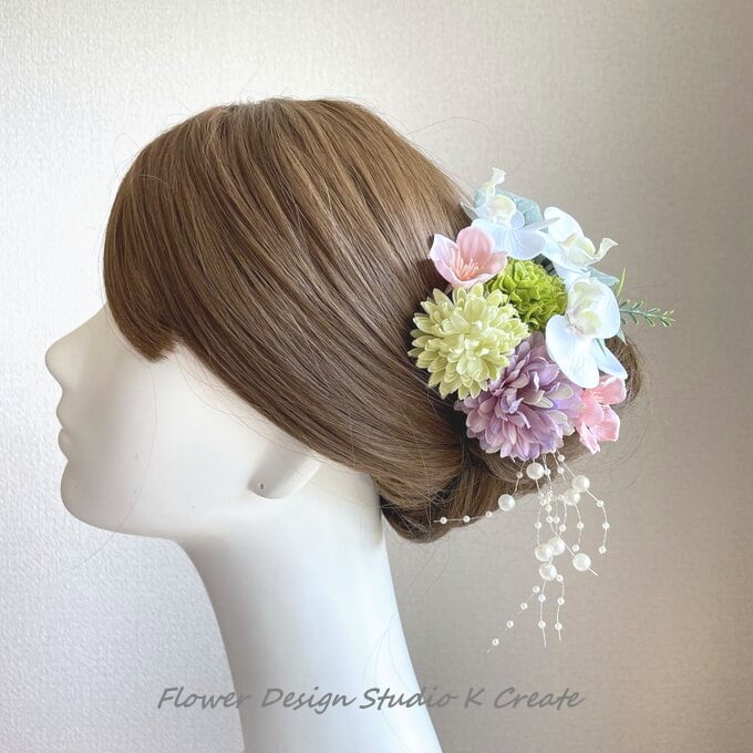 ミニ胡蝶蘭とマムと桜のヘッドドレス 浴衣髪飾り 桜 ウェディング 成人式 結婚式 髪飾り 和装 前撮り 卒業式袴 花嫁ヘア 入学式 卒業式 結婚式