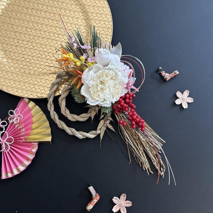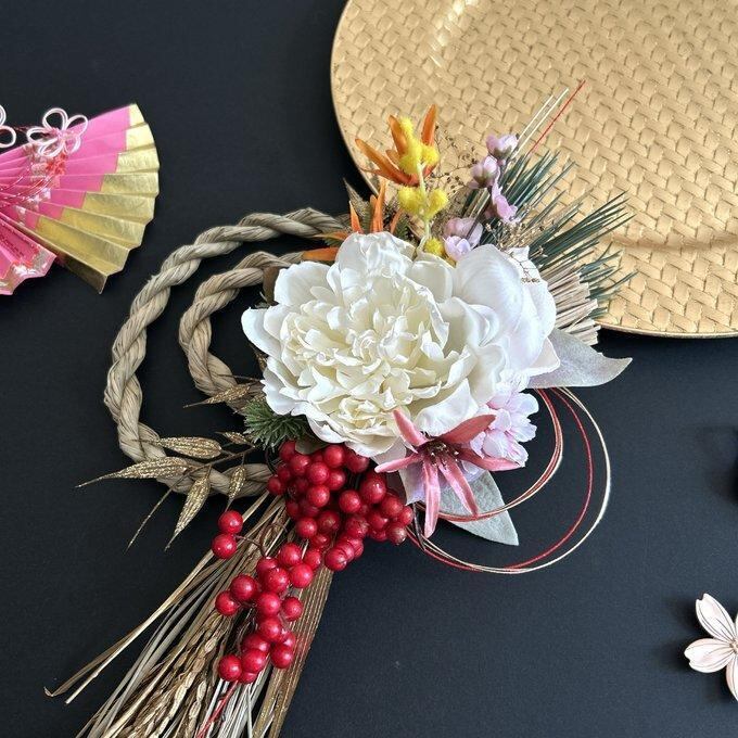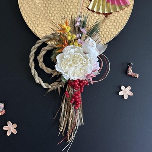 2026年☆お正月飾り☆白いピオニーと椿のしめ縄飾り しめ飾り お正月飾り 〆飾り しめ縄飾り ラッピング無料 早割 紅白 ピオニー ミモザ 水引 桃の花 笹 松